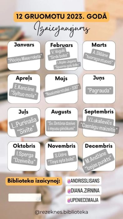 Rēzeknis Centraluo biblioteka (RCB) jaunu godu īsuokuse ar jaunu aktivitati – bibliotekys Instagram konts @rezeknes.biblioteka 2023. godā veļteits latgalīšu literaturai. Izaicynuojums kotru mienesi puorskaiteit kaidu gruomotu latgaliski, izgleitojūšys aptaujis i jūceigī vaicuojumi ir tik daļa nu aktivitašu, kū janvara pyrmūs nedeļu laikā biblioteka socialajā medejā jau paspiejuse pīduovuot.