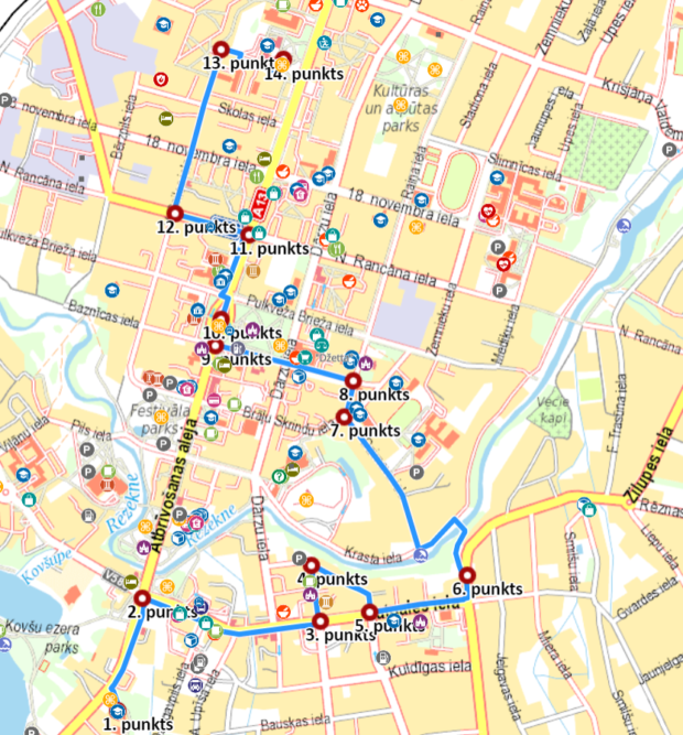 Pastaigys suokums svātdiņ, 5.martā, 14 stuņdēs paradzāts pi Rēzeknis Muzykys vydsškolys Atbreivuošonys alejā 56, kur atsarūn ari Fraņča Trasuna pīmineklis. “Tuoļuok myusu ceļš vess pi Latgolys kongresa symtgadei veļteituo pīminekļa, piečuok Latgolys īla ar dastuošonu pi Vladislava Luoča Latgalīšu rakstnīceibys muzeja ākys Kruoslovys īlā. Kai jau klasiski svātdīnei, cauri tiergam īsim iz bazneicu. Pi Rēzeknis Jezus Sirds katedralis apsavērsim veiskupam Julianam Vaivodam veļteitū pīminekli i atsaguoduosim par Latgolai svareigim cylvākim, kas ir bejuši saisteiti ar itū bazneicu i draudzi. Vāluok škārsuosim Rēzeknis upi i tiksim lobajā krostā, tam sekuos kuopīņs školys kolnā pi Rēzeknis Vaļsts 1. gimnazejis i Rēzeknis Muokslys vydsškolys. Piec tam myus sagaida nūstuošona pi Latgolys Muorys i Valerejis Seilis sātys, pastaigu nūslādzūt pi Nikodemam Rancanam veļteituo pīminekļa pi Rēzeknis Tehnologeju akademejis golvonuos ākys,” maršrutu raksturoj Laurs Magazeiņs. Latgaliskuo pastaiga ir plānuota kai eisa ekskurseja pa latgaliskajom vītom Rēzeknē, kas piļsātā līcynoj par aktivūs latgalīšu īguļdejumu. Tuos finišs paradzāts ap 15.30 stuņdem pi Rēzeknis Tehnologeju akademejis golvonuos ākys Atbreivuošonys alejā 115.