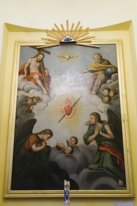 Gleznys autors nav zynoms, suokumā nazynuojuši ari nūsaukumu. Sprīžūt piec tamā radzamuo, dūmuojuši, ka tei varātu byut Svātuo Trejadeiba, tok gareidznīki piečuok izpietejuši tuos eistū nūsaukumu – gleznā radzama Vyssvātuokuos Suopu Dīvmuotis zūbyna caurdūrtuos sirds gūdynuošona.