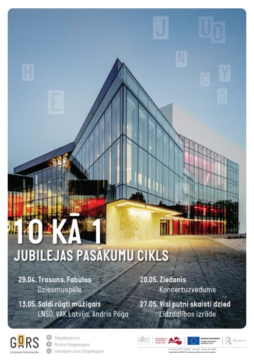 Latgolys viestnīceibys “Gors” jubilejis svineibu pasuokumu cykla “10 kā 1” kulminaceja ir gaidoma 13. majā koncertprogramā “Saldi rūgti mūžīgais”, kur iz Leluos zālis skotivis puļcēsīs Latvejis Nacionalais simfoniskais orkestris, Vaļsts Akademiskais kors “Latvija” i dirigents Andris Puoga (Poga), kas ir koncertzālis ilggadeji draugi. 20. majā koncertizvadumā “Ziedonis” varēs sasatikt ar Renāru Kauperu, Jāni Strazdiņu, Latvejis Radejis kori i dirigentu Sigvardu Kļavu, kab izdzīduotu Imanta Kalniņa dzīsmis ar Imanta Zieduoņa (Ziedoņa) dzeju, kā ari byut Zieduoņa dzejūļūs i poša autora bolsa īskaņuotuos puordūmuos. Jubilejis pasuokumu cykls tiks nūslāgts 27. majā, sasasateikūt dobā, muzykalā leidzdaleibys izruodē “Visi putni skaisti dzied”.