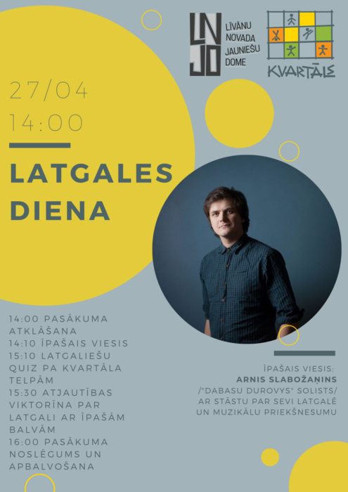Leivuona nūvoda jaunuotnis iniciativu centrā “Kvartāls” 27. aprelī nūtiks Latgolys dīna. Pasuokuma laikā byus vareiba pīsadaleit vysaiduoka veida konkursūs puorbaudūt sovys zynuošonys par Latgolu, klauseitīs eipašuo gosta – Arņa Slobožanina –, stuostūs i muziciešonā, kai ari dazynuot vysaiduoka veida Latgolys jaunumus i aktualitatis.
