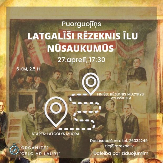 Latgolys kongresa dīnā 27. aprelī gids Laurs Magazeiņs nu “Ceļo ar Lauri” aicynoj iz puorguojīni “Latgalīši Rēzeknis īlu nūsaukumūs”. Maršruts itūreiz vess pa Rēzeknis īlom, kas nūsauktys Latgolys kulturys darbinīku vuordā. Guojiejus sagaida stuosts par 1917. gods Latgolys kongresu i tuo laika radzamuokajim kulturys i sabīdriskajim darbinīkim. Plānuots nūīt sešus kilometrus 2,5 stuņžu laikā. Starts: Latgolys Muorys pīmineklis 17.30 stuņdēs. Finišs: Rēzeknis Muzykys vydsškola ap 20 stuņdem. Dasasaceišona ekskursejai Rēzeknis Turisma informacejis centrā (tel. 26332249, e-posts: tic@rezekne.lv).