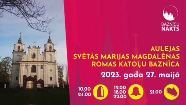 27. majā Latvejā byus Bazneicu nakts i Atvārtūs bazneicu dīna, kurā aicynoju nūbraukt ari pi myusu iz Auleju – Aulejis Sv. Marejis Magdalenys bazneicu, 18. godu symta baroka styla myura bazneicu ar divejim tūrnim. Nu desmitu reitā da pušnakšu kotrys grybātuojs var apsavērt bazneicu i tamā asūšūs muokslys pīminekļus, kai ari prezentaceju par bazneicu, bet nu sešu vokorā pīsadaleit Bazneicu nakts nūtikšonuos. 12.00, 18.00 i 22.00 stuņdēs skanēs bazneicys zvoni, bet 21.00 aicynojam iz kūpeigū “Tāvs myusu” skaiteišonu. Vaira par Bazneicu nakti ITE.