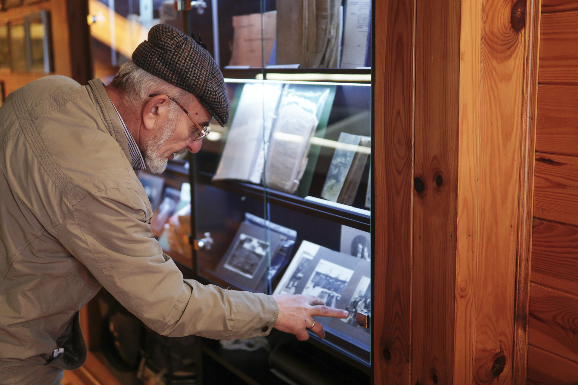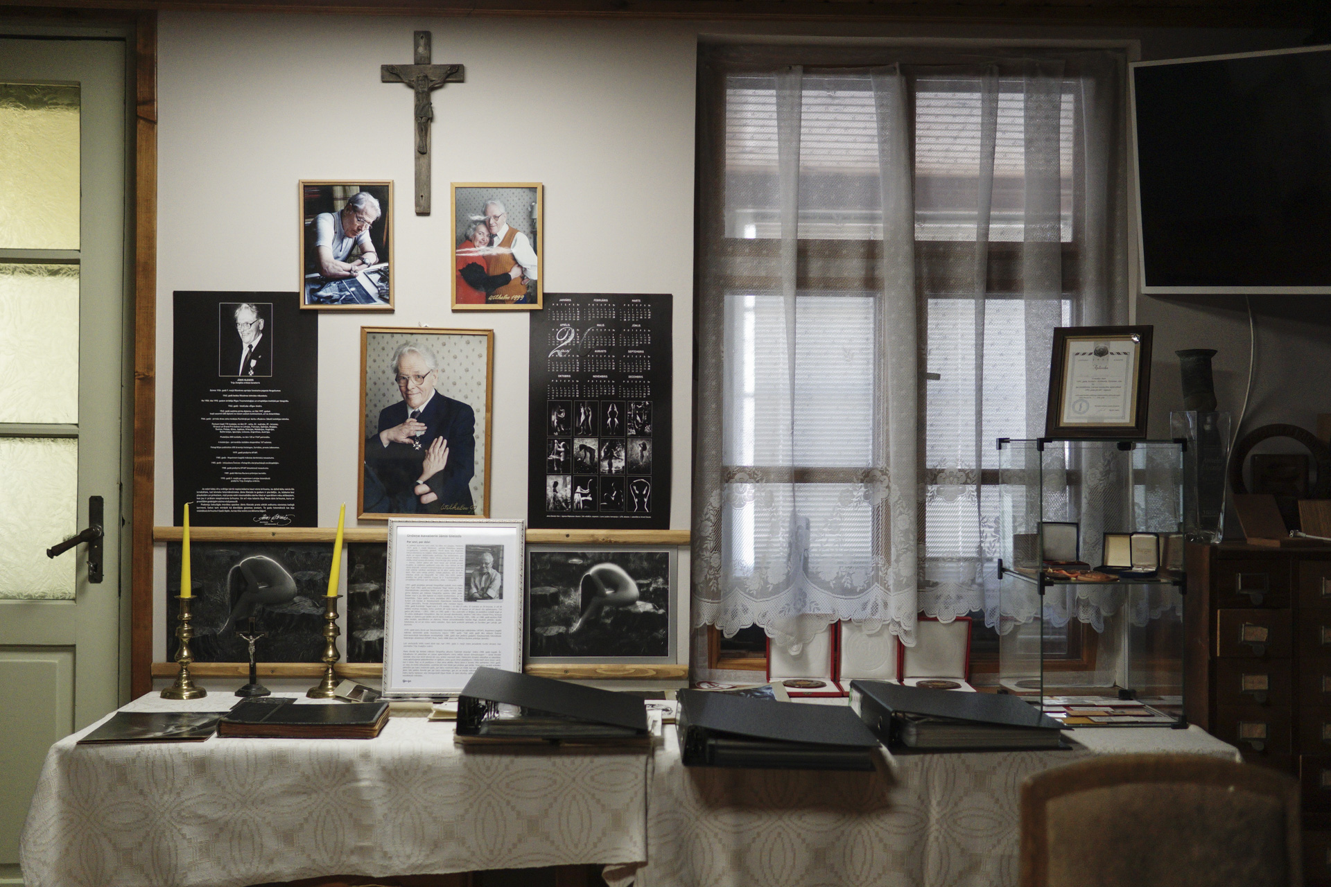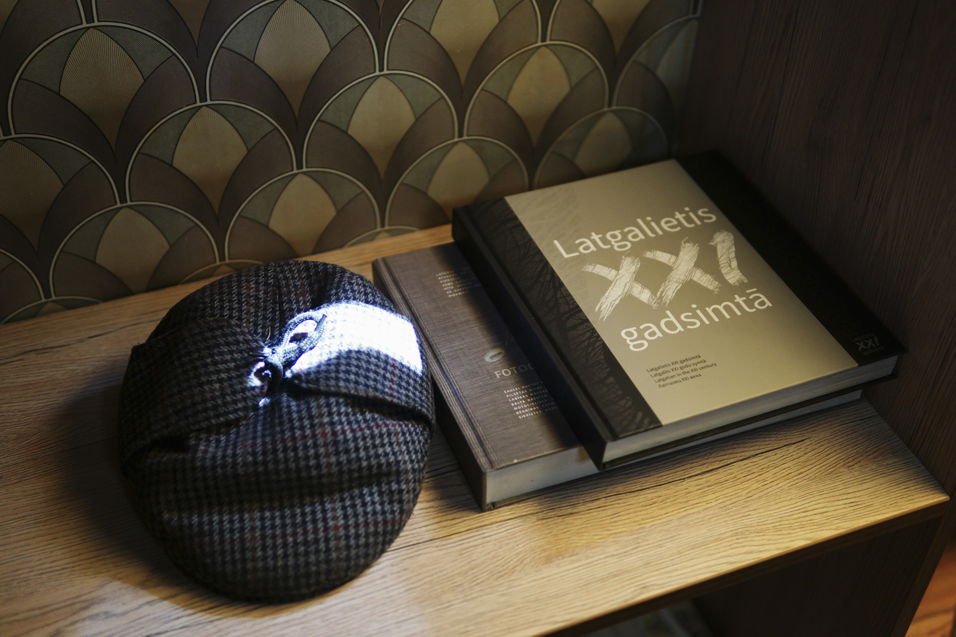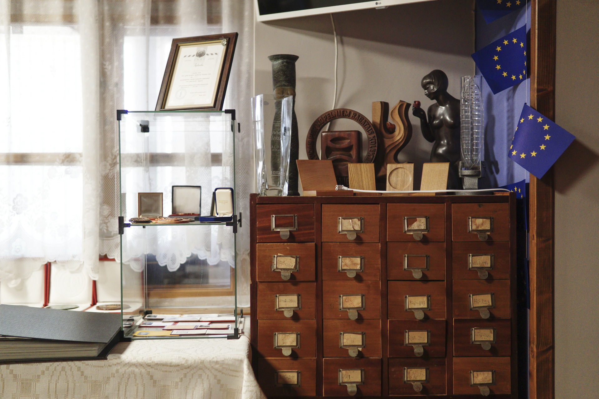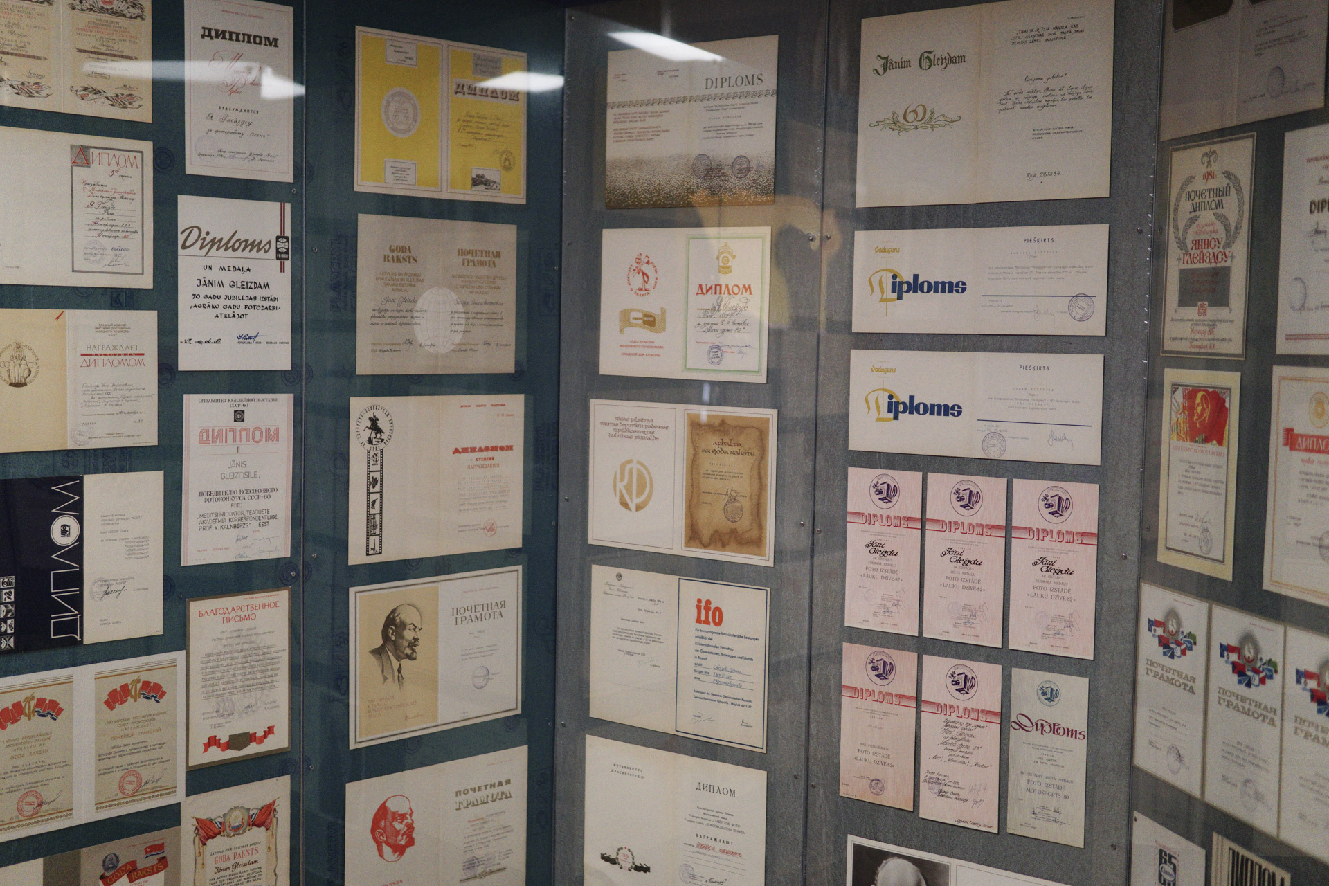 Gleizda pīminis ustobā apsaveramys kai juo dzeivis atminis, tai ari medalis, gruomotys, prīškmati, apbolvuojumi i vysaiduoki pietnīceibys materiali, kas gaida jaunūs studentus i pietnīkus. “Struodoju, līku, kuortoju, skeneju. Vyss nav tik vīnkuorši. Biļdis vysaidys – lelys i mozys. Vyss ar vīnom rūceņom,” par dorbu pi ustobys īkuortuošonys i materialim stuosta fotografs.