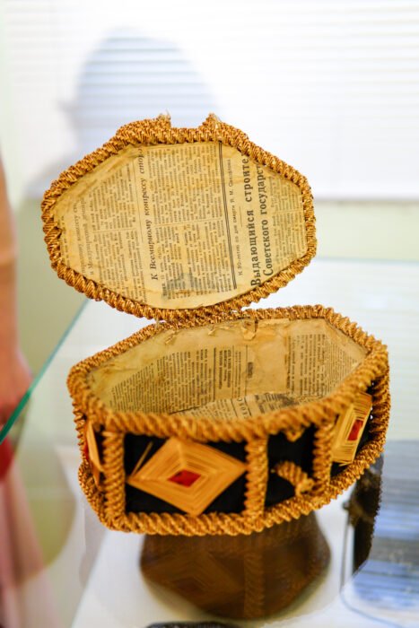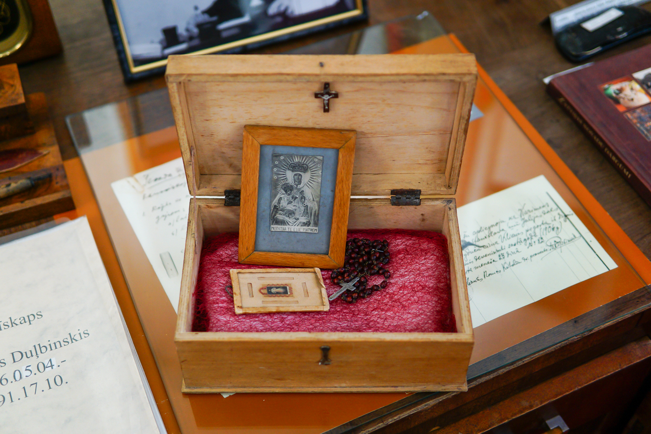 Portals lakuga.lv turpynoj apceļuot Latgolys muzejus i viesteit par tūs kruojuma duorgumim. Itūreiz bejom gostūs Viļakys muzejā, kura direktore Rita Gruševa daudzu vierteibu vydā izcēle treis: trafaretu, ar kuru markēja svīsta kastis eksportam Marienhauzenys muižys foļvarkā Borisovā, skreineiti, kura taiseita karagiustekņu nūmetnē Račūs, i veiskupa Kazimira Duļbinska izsyutejumā lītuotū lyugšonu oltoru-skreini.