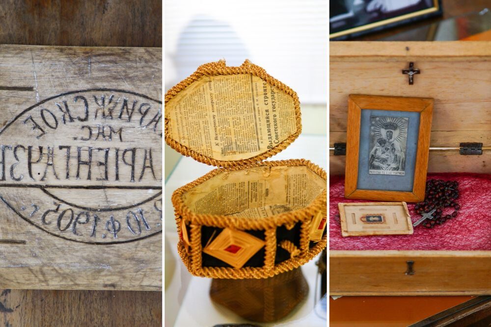 Natuoli nu Viļakys, Račūs (niu Medņovys pogosts), 2. pasauļa kara godūs vuocu armeja beja sataisejuse krīvu karagiustekņu nūmetni. Tei bejuse atkluota tipa – bez napuorvarama žūga, tik ar apsardzi, partū giustekni varēja raudzeit koč kai dabuot sev puortyku. Preteimā jī vītejim cylvākim pīduovuojuši ari itaidys pošu taiseitys skreineitis, kas izgataveitys nu tuo, kas beja atrūnams – cysu, vysaidu kokoru, gazetu lopu. Rita Gruševa sprīž, ka, vysdreižuok, karaveiru vydā bejs kaids amatnīks, kas prats taidys sataiseit. Itū prīškmatu muzejs sajēme duovonā nu viļacuonītis, vītejuo etnografiskuo ansambļa vadeituojis Albīnys Veinys (1931-2021), kura bierneibā dzeivuojuse natuoli nu Raču karagiustekņu nūmetnis. Kod vuocīši atsakuope, jī barakys, kur atsaroda giustekņu nūmetne, ar vysom municejis nūlyktovom izsprydzynuoja. Itys spruodzīņs attāluots ari muzeja kruojumā asūšajā Juliāna Supis gleznā.