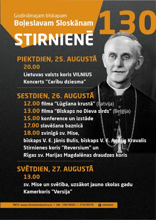 Nu 25. leidz 27. augustam Stiernīnē tiks svieteita gūdynojamuo veiskupa Boleslava Sloskāna (1893-1981) 130. jubileja, informej tuos organizatoru puorstuove Īva Zepa. Pīktdiņ, 25. augustā, Stiernīnis Sv. Laurencija Romys katuoļu bazneicā koncertēs Leitovys vaļsts kors “Vilnius”, sastdiņ tiks demonstrātys kinys, nūtiks konference, izstuode i svineiguo Sv. Mise, sovpus svātdiņ varēs sajimt svieteibu, suocūt jaunū vuiceibu godu.