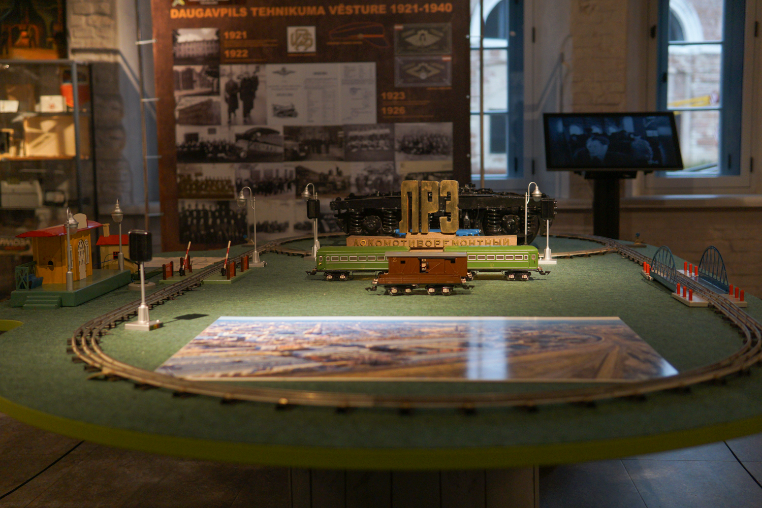 Sevkuram interesentam “Inžineru arsenalu” ir vareiba apsavērt individuali voi gida pavadeibā. Cylvākim ar prīškzynuošonom, īspiejams, ari nav vajadzeigs papyldu stuostejums, vystik gida pavadeibā izadūs dazynuot interesantus i reši zynomus faktus. Pīmāram, vīna nu ekspoziceju veļteita taišni Daugovpiļs piļsātys viesturei. Te var īpasazeit ar Daugovpiļs Lokomotivu remontryupneicys viesturi. “Pīmāram, te ir originalais lokomotivu skrytuļu puors, tys ir eists, na makets. Sver vaira par pusūtru tonnu, mes jū trejatā dabuojom te viersā. Varbyut izaklausa kai gryuts dorbs, tok skrytuli ir cīši labi sabalansāti, jūs var cīši vīgli rytynuot iz prīšku,” stuosta presis specialists Aleksandrs. Jis ari dasoka, ka Daugovpiļs viesture ir cīši saisteita ar dzeļžaceļa viesturi. Centrā ir ari originalais brugis nu senejuos stacejis, kura nav myusu dīnu Daugovpiļs staceja. Pyrmuo piļsātys dzeļžaceļa staceja atsaroda Daugovpiļs 1. maja rajonā. Sovpus, kai stuosta Raitis Kikusts, Lokomotivu remontryupneicai beja ari sovs muzejs, tok, par nalaimi, muzejs divejis reizis tyka appludynuots. Poši muzeja puorstuovi raudzeja saglobuot viesturiskuos vierteibys, vys jim tys da gola naizadeve, deļtam lela daļa nu vysu eksponatu tyka “Inžineru arsenalā”.
