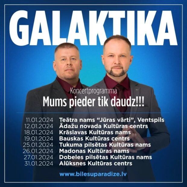 2024. gods suokumā nu janvara da apreļa iz jaunuo albuma “Mums pieder tik daudz” koncertim vysā Latvejā – Ventspilī, Kruoslovā, Modūnē, Olyuksnā i cytuos vītuos – aicynuos klauseituoju īmeiļuotuo grupa “Galaktika”. Koncerti plānuoti daudzuos vītuos, tymūs grupys dybynuotuojim – solistam Normundam Zušam i tausteņinstrumentalistam Vitoldam Gornevam – dasavīnuos ari pavodūšuo grupa “Crazy Daisy”, kurā muzicej Raitis Keišs – bass, Gatis Ivans – gitarys, Mikus Rullis – bungys, Haralds Stenclavs – tausteņinstrumenti. “Tei ir eistyna prīcys šaļts, ka otkon varim byut kūpā, varim vīns ūtram snēgt lobys emocejis kai ar jaunuom dzīsmem, tai ar tom, kas jau zynomys i īmeiļuotys, tok par vysu svareiguokais – byušona sūpluok,” tai grupys “Galaktika” dalinīki. Koncertu beleti daīmami ITE.