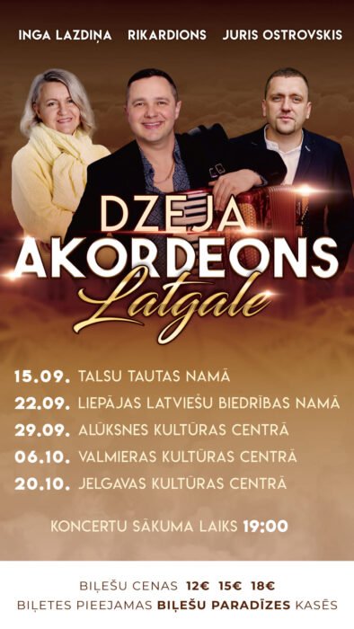 Treis vuordu “Dzeja. Akordeons. Latgale” salykums pīcūs koncertūs Latvejā – jau izskaniejušūs Talsūs, Līpuojā, bet vēļ gaidomūs Olyuksnā, Valmīrā i Jelgovā – teik raksturuots kai “muzykali skaneiga i eipaša gaisūtne, pyrmatneigys sajiutys, etniskuo pīdareiba, latgalīšu unikaluo vīnkuoršeiba i sirsneiba”. Koncertprogramā apsavīnuos Inga Ruka-Lazdiņa, kura plotuoku atpazeistameibu dabuojuse ar 1994. godā komponātū dzīsmi “Ko man ar tevi padarīt”, kod “Mikrofona” aptaujā sajimtys ari nominacejis “Gada debija” i “Lipīgākais meldiņš”. Inga pīsadalejuse ari Latvejis Televizejis raidejumā “Sirdsdziesma”. Taipoš koncertprogramā pīsadaleis Rikardions aba Rihards Millers, kurs ari pīsadalejs vairuokūs TV šovūs i sajiems plotu atpazeistameibu pasasokūt vairuokom eipašu papularitati dabuojušom dzīsmem “Odiņš”, “Mīlas tuksnesis”, “Gliemezis”, “Vilciens”, “Mākoņos” i c. Sovpus trešuo koncertprogramys dalinīka Jura Ostrovska vuords ploti zynoms vysā Latvejā kai solo muokslinīkam, tai apvīneibys “Patrioti.lg” i grupys “Dvinskas muzikanti” dalinīkam, taipat kai juo komponātuos dzīsmis – “Daugaveņa”, “Viss tikai tev”, “Hej, bruoļ latgalīt”, “Vacuoku sāta”. Koncertu beleti daīmami ITE.