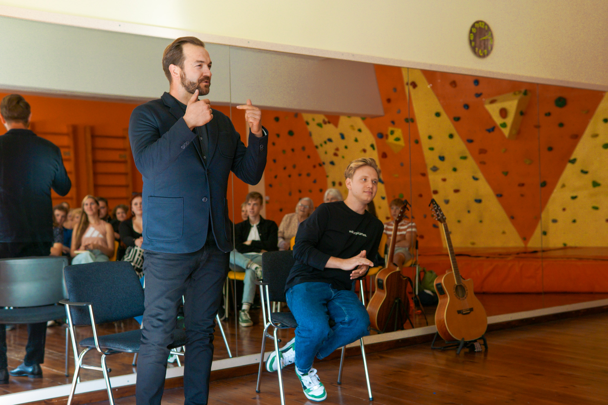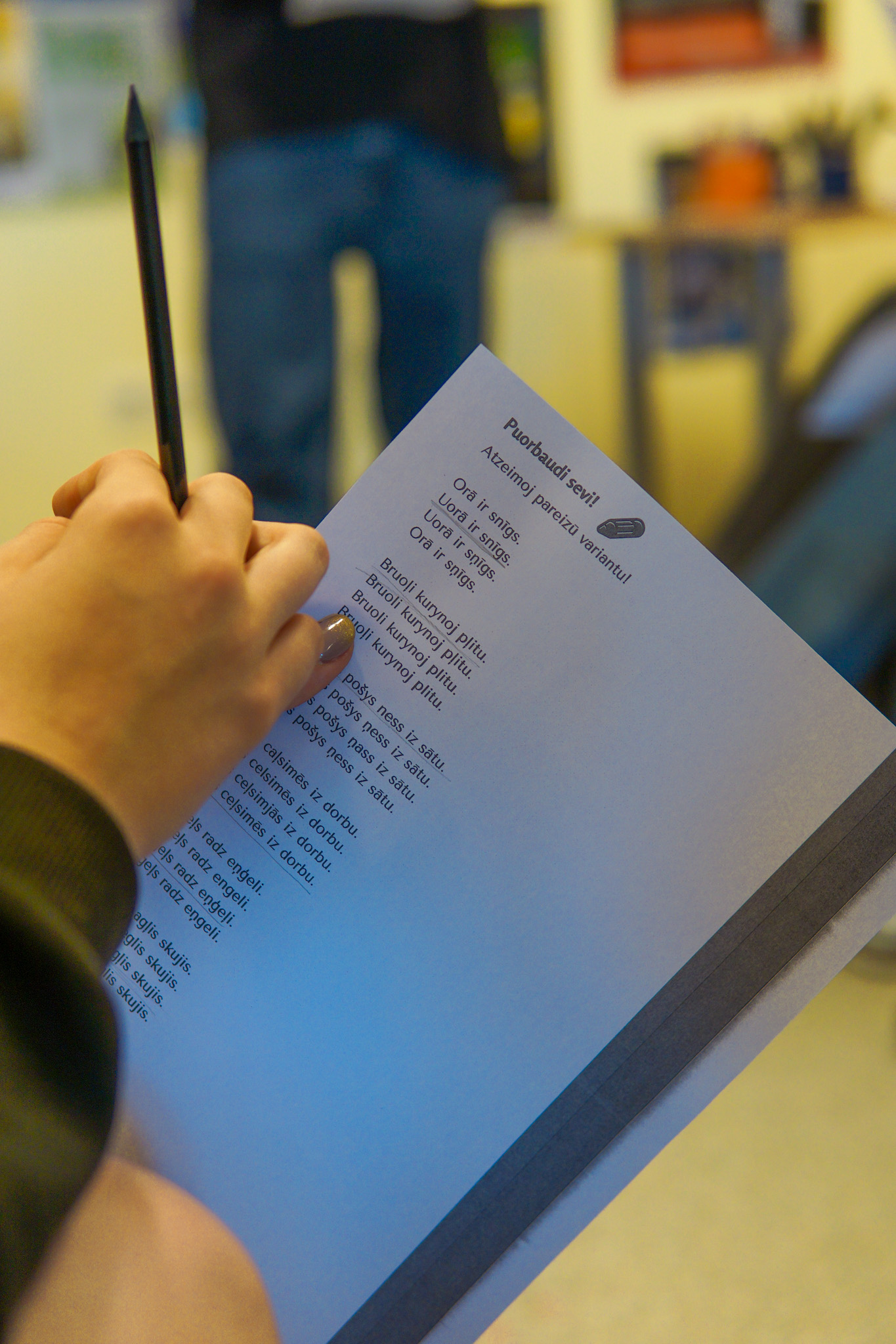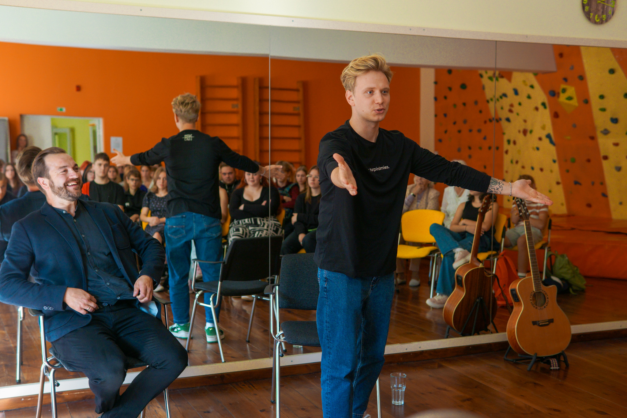 Projekta pādejais pasuokums, kura laikā beja vareiba sasatikt i pasarunuot ar muziki i akteri Kristapu Rasimu i radejis DJ i socialūs kontu puorvaļdeituoju Lauri Zalānu, pulcynuoja aptyvai 70 jaunīšu. Pasuokums beja sadaleits vairuokuos daļuos – nu suoku kūpeiga diskuseja ar Kristapu i Lauri, kurys laikā jaunīšim beja vareiba aizdūt tim interesejūšus vaicuojumus, sovpus piec diskusejis jaunīši kūpā ar Kristapu i Lauri devēs piļdeit aizdavumus treis dažaiduos centra “Kvartals” vītuos. Tī beja golda spēlis “Čipierksneits” vaicuojumi, aizdavums atminēt latgaliskus vuordus voi puorskaiteit i pīraksteit tekstu latgaliski. Vystik Mareja pīzeist, ka gona daudzi jaunīši vyspuor nazyna latgalīšu volūdu, deļtam ir svareigi saglobuot balansu storp latgalīšu i latvīšu volūdom, kab jaunīts nasajustu naārtai, ka vysa pasuokuma garumā navar izsekuot leidza i saprast vysu saceitū.