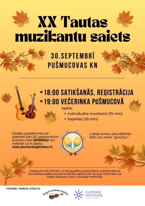 30. septembrī 19.00 stuņdēs Ludzys nūvoda Pušmucovā nūtiks jau 20. Tautys muzykantu saīts, kurā muzicēs kai individualī muzykanti, tai ari muzykantu grupys, informej pasuokuma organizatoru puorstuove Iveta Dukaļska. Jubilejis reizē paradzāta ari muzykantu gūdynuošona.
