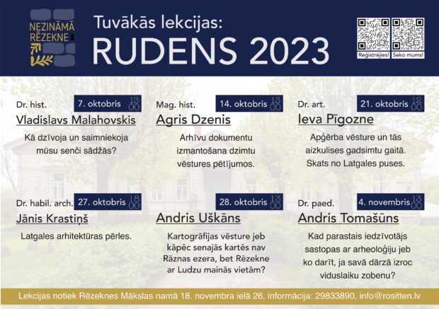 Ar mierki snēgt plašuoku īskotu vysaidūs kulturys i viesturis aspektūs, suocūt ar 7. oktobri Latgolys dzeivuotuoji i interesenti aicynuoti pīsadaleit iniciativys “Nezināmā Rēzekne” organizātajā zynuotnis populariziešonys lekceju rudiņa cyklā, kas teik organizāts sadarbeibā ar Rēzeknis Muokslys nomu, informej organizatoru puorstuovs Andris Uškāns.