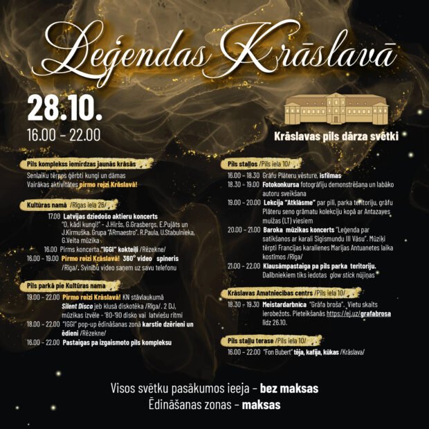 Legendu nakts byus cīši loba vareiba izzynuot vysa kū ap Plateru pili i parku. Piļs staļa kuormā nu 16.00 stuņžu varēs vērtīs eiskinys par pili i parku, bet nu 18.40 da 19.00 – apsavērt fotokonkursa “Atklāj Krāslavas pils kompleksu no jauna!” i pīsadaleit fotokonkursa daleibnīku sveikšonā. Bet piec tuos 19.00 stuņdēs lekcejā “Atklāsme” Kruoslovys nūvoda muzeja, Kruoslovys nūvoda bibliotekys puorstuovi kūpā ar Antazaves muižys gostim nu Zarasu (Leitovā) stuosteis par Kruoslovys grafu Plateru piļs, parka teritoreju i senejūs gruomotu kolekceju.