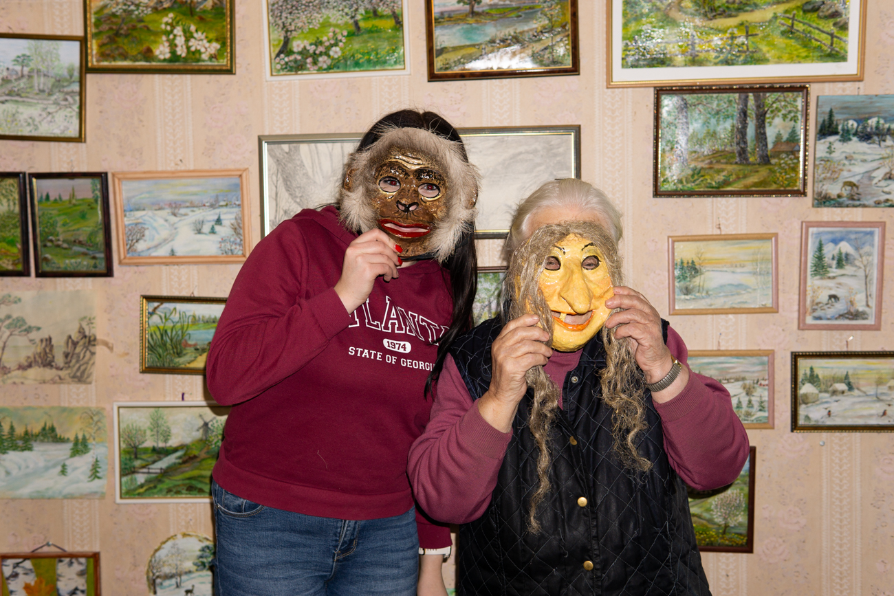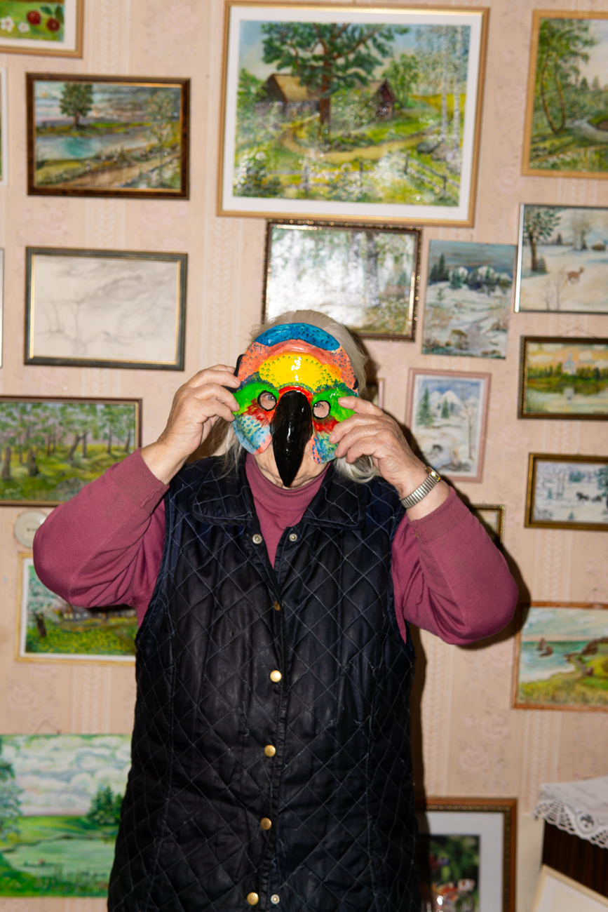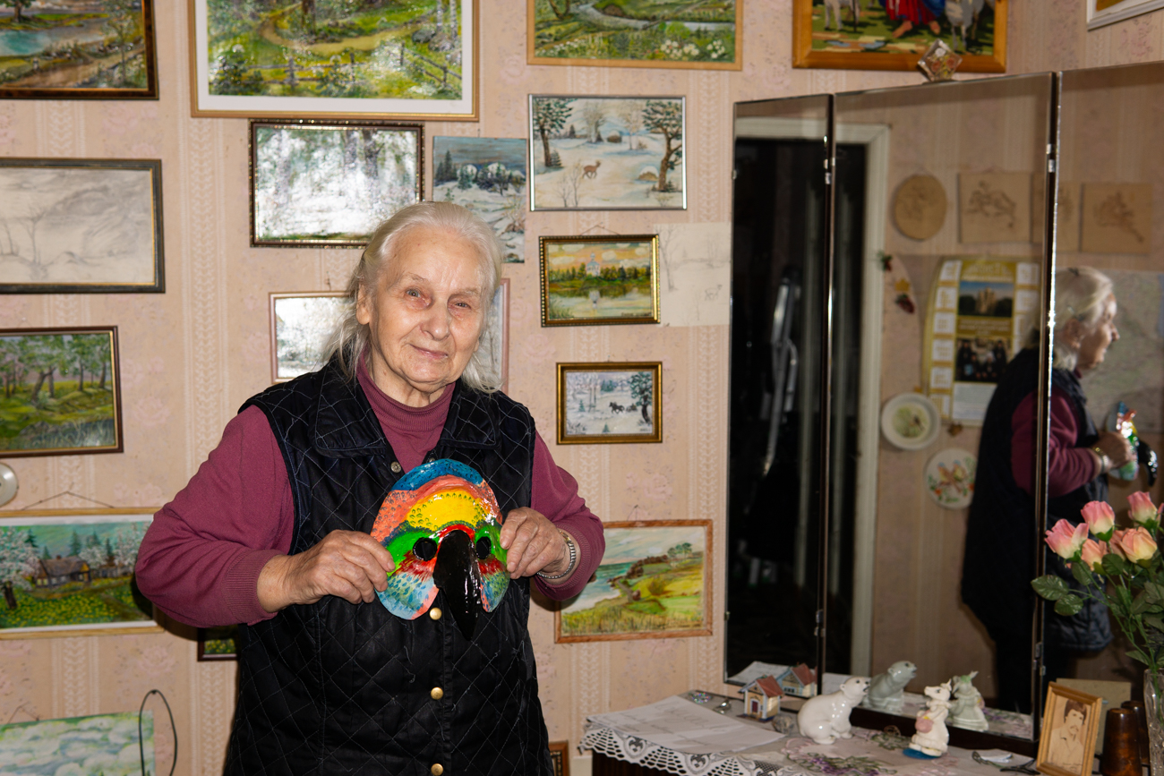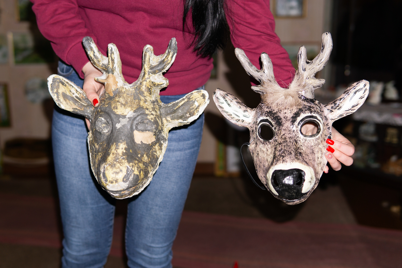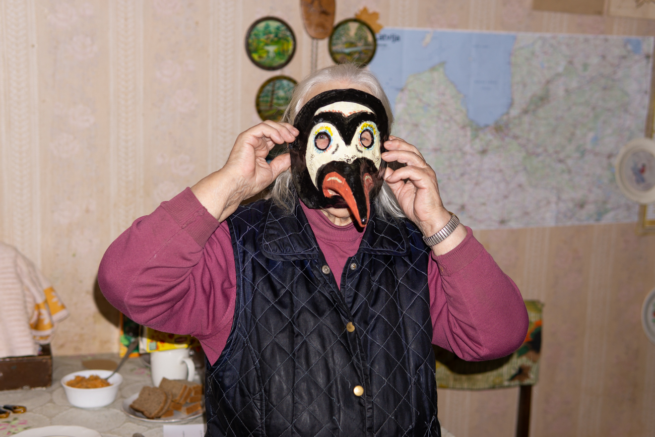 “Tys nav dorbs tik par leimiešonu, tī ir vajadzeigs ari spāks, kab izgrīztu, izskruopātu ar nazi smolkuos vītenis, izlīkumus, kas ir lels spīdīņs taišni iz rūkom. Maskys nav viņ kruosuotys, tok ari papyldynuotys ar nu lynu veiduotim motim, vylnu, “ stuosta masku meistare.