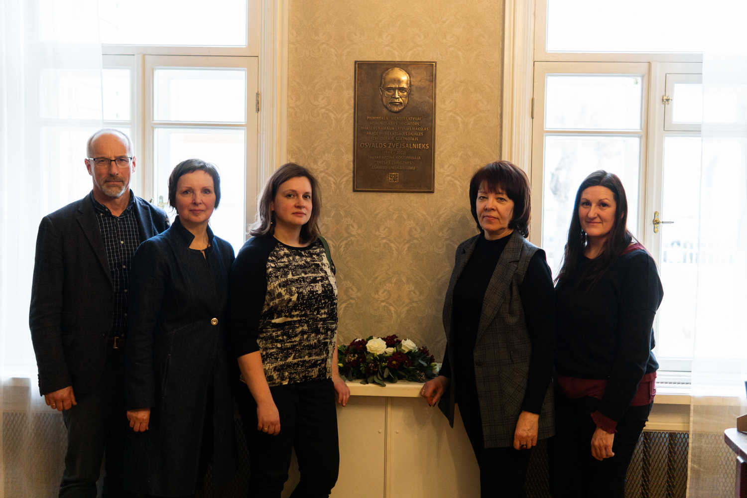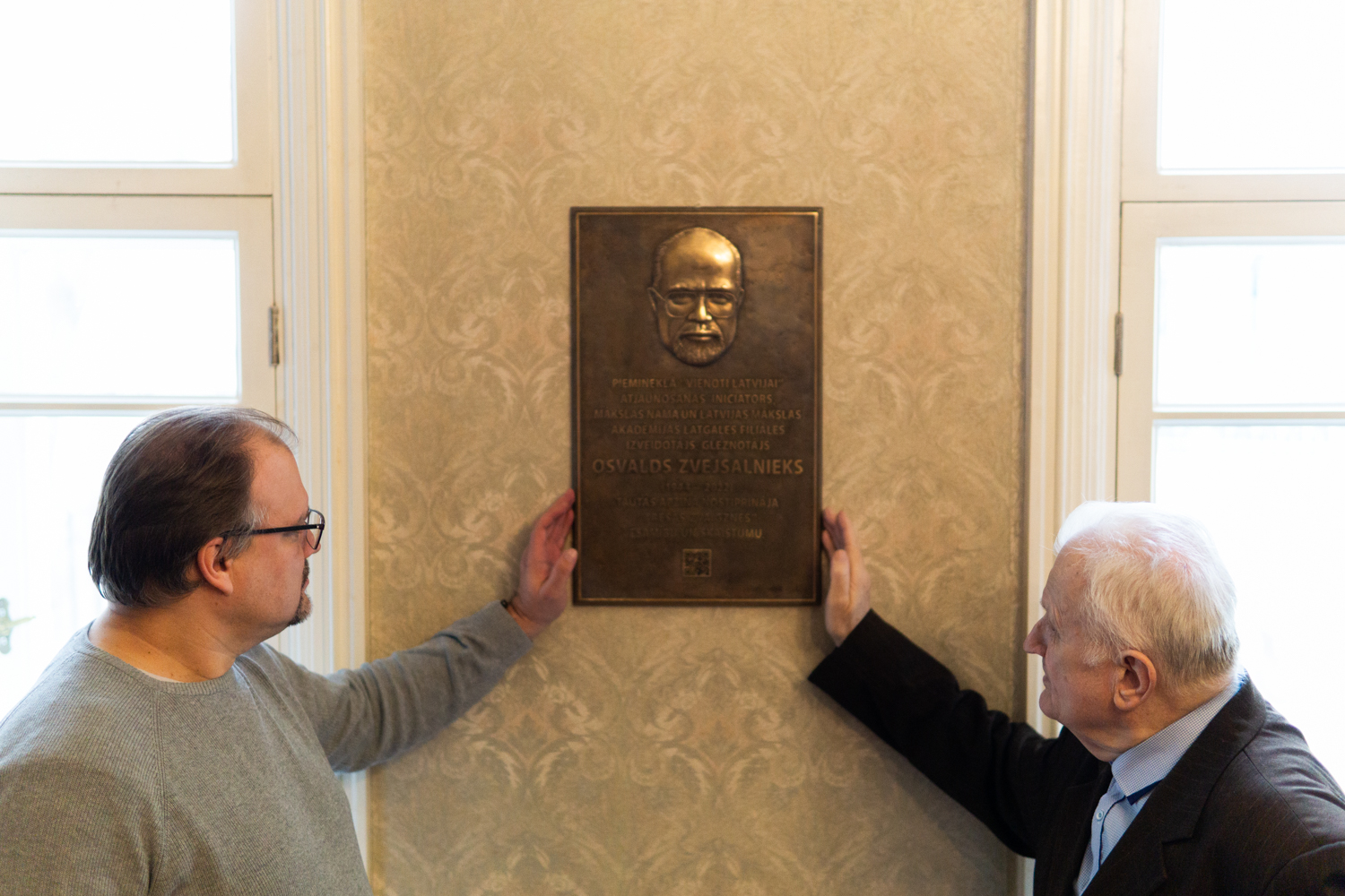 Pīminis zeimi atkluoja Osvalda Zvejsalnieka krystdāls Artūrs Zvejsalnieks, kurs ari pastreipuoja, ka pats Muokslys noms ir kai pīminis zeime Osvaldam. “Atmynūs, kai itū āku suoce restaurēt – nu nūplukušys i nūlaistys padūmu armejis kara komisariata ākys, kas beja saveiduota kabinetūs, ar studentu i školys audziekņu rūkom lāni i pacīteigi bez lelu finanšu leidzekļu, tok vairuok ar Osvalda prasmem saorganizēt i sarunuot, noms tyka atjaunuots.”