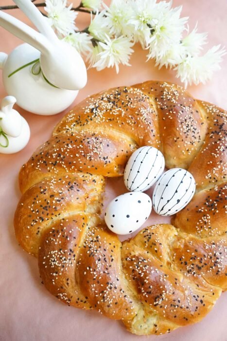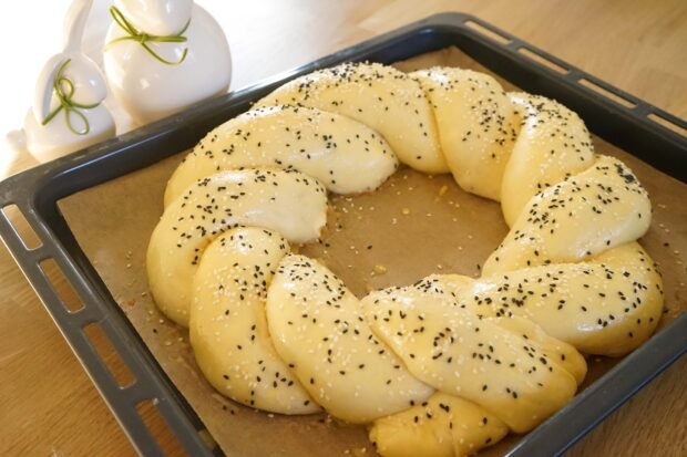 Cepeškruosni uzkarsej da 185 gradu. Kod kriņgeļs ir izryudzs, tū puorzīž ar sakultū ūlu, puorkaisa ar sezama siekleņom. Cap 30-35 minutys. Izjam nu kruosns, atdzesej i ād gordu muti.