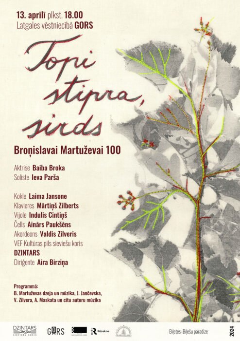 Itūgod svietejam dzejneicys i dzīsmineicys Bronislavys Martuževys (1924-2012) symtgadi. Vīna nu juos jubilejis nūtikšonu ir koncertizvadums “Topi stipra, sirds”, kas 13. aprelī izskanēs Latgolys viestnīceibā “Gors”, piečuok ari Reigā i Lubuonā. Tuo muokslinīcyskū koncepceju veidoj dirigente Aira Birziņa i aktrise Baiba Broka. “Maņ ruodejuos cīši svareigi, lai tī izskaņ ari latgalīšu volūda,” soka Baiba. Intervejā jei stuosta ari par sovom latgaliskajom saknem, pīredzi iz skotivis i kinā runuot latgaliski, kai ari sajiutom, Jaunajam Reigys teatram atsagrīžūt Luočplieša īlā.