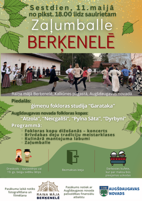 Sastdiņ, 11. majā, nu 18.00 stuņžu Augšdaugovys nūvodā, Raiņa sātā Berkenelē, nūtiks sareikuojums “Zaļumballe Berkenelē”, kab aktualizātu breivdobys deju tradicejis lauku vidē, informej pasuokuma organizatori. Vokora gaitā vysaidys nūtikšonys vadeis saimu foklorys studeja “Garataka” nu Reigys i Augšdaugovys nūvoda folklorys kūpys “Atzola”, “Neicgalīši”, “Pylna Sāta” i “Dyrbyni”.
