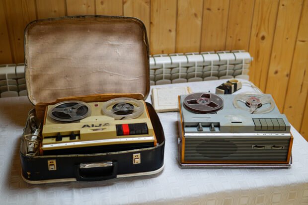 Muzeja vadeituoja Ligita Spridzāne ruoda divejus lentu magnetofonus. Vīns atsarūn čemodanā, tam sūpluok ir ari mikrofons i cyti pīdarumi. Kai stuosta Ligita, tys saglobuots taišni taidā komplektacejā, kaidu Ontons Slišāns izmontuojs dzīšmu īraksteišonai. Dīvamžāļ tys vaira nasadorboj, tok lentu atskaņuošonai teik izmontuots ūtrys. Ari mums teik tei prīca pasaklauseit vīnu nu 1971. goda īrokstu. Tei ir gona ekskluziva vareiba, jo muzejā itys magnetofons teik eipaši saudzāts. Taipat lentys, kab tūs saturs napagaistu, teik digitalizātys. Ligita navar precizi pasaceit, cik taidu lentu ir, jo ik pa laikam pasaruodūt ari jaunys. Tuos ryupeigi juonūsaklausa, jo cytreiz ruodīs, ka atnasts kaids estradis muzykys īroksts, tok pieški vydā atskaņ Ontona Slišāna īraksteituo foklora!