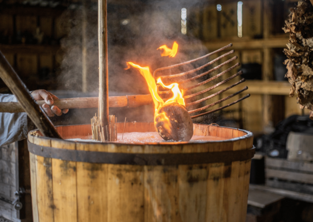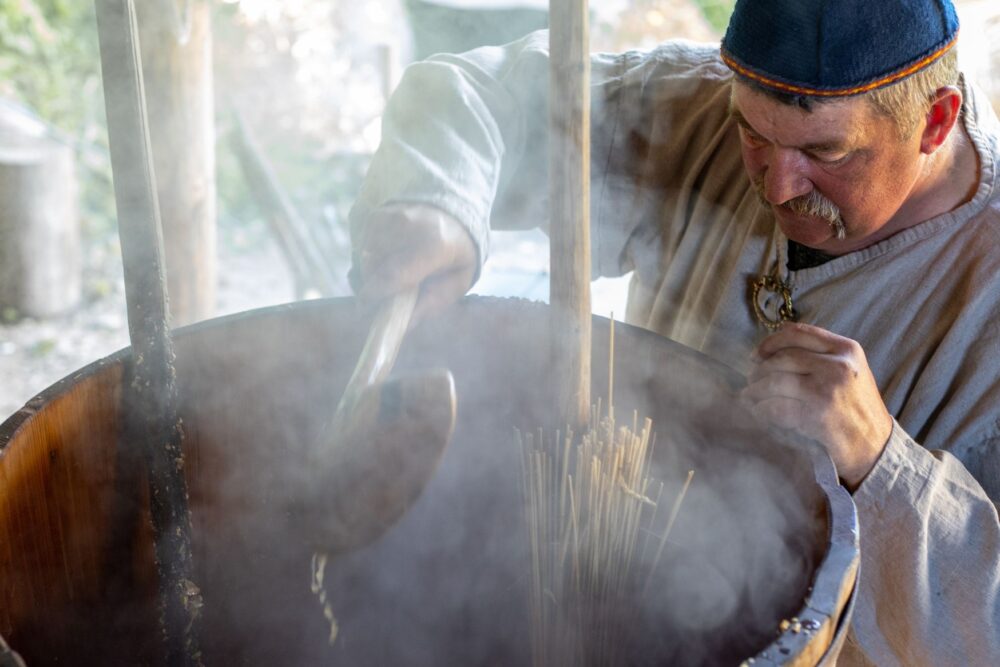 Ols gataveišonai vajadzeigs lels daudzums iudiņa, partū tū iz vysa bīžuok siļdeja pierts tūverūs. Iudiņa uzkarsiešonu parosti veic iz gunkura, tū apvīnojūt ar akmiņu karsiešonu. Samoltais īsols teik saldynuots cytā kubulā, aplejūt tū ar korstu iudini tik daudz, lai meņte tymā nastuov, tok ari nakreit. Piec saldynuošonys īsols teik īlykts īprīšk sagataveitajā zlauktā, atjaukts ar korstu iudini i apeiņu nūvuorejumu. Zlaukti kotram meistaram bīži viņ atsaškeiruši. Cytam bejs garenisks trauks, gataveits nu vīna kūka, cyts par zlauktu saucs gaļdeņu trauku, kas leidzeigs kubulam. Tok vysim bejuse vīna leidzeiba – trauka apakšā ir caurumeņš, kas paradzāts mysys filtracejai.
