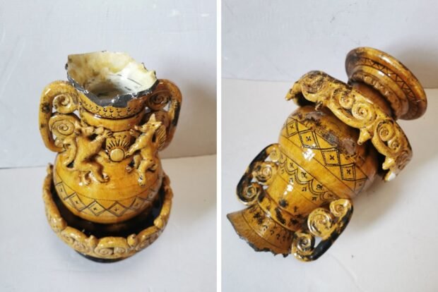 “Vysapyrma vāze tyka ryupeigai teireita kai kimiski, izmontojūt vysaidu škeidumu kompresis, tai mehaniski – ar instrumentim, nūteirejūt nateirumu kuorteņu. Process beja sarežgeits – vāzis glazurys maituošonuos deļ tū nadreikstēja mērcēt i pakļaut iudiņa īdarbeibai. Piec tam nūstyprynuota glazura, ar cīši smolkys i meikstys ūtenis paleidzeibu īpiļdeits leimis škeidums glazurys plaisuos i gaisušūs fragmetu maleņuos, viereigai pīspīžūt atdalejušūs glazurys fragmentus vāzis pamatmasai. Glazurys izbyrumi aizpiļdeiti, mehaniski apstruoduoti i sleipāti ar smolku smiļšpapeiru. Vāzis viersejuo mola pīveiduota tieļnīceibys plastilinā, kab tei precizi turpynuotu nūlyuzušū vāzis kakleņu. Izveiduotajai plastilina vāzis viersejai molai tyka nūjimta divpusejuo forma i tryukstūšais fragments atlīts gipša masā. Tys apstruoduots, precizi atzeimāts, pīgrīzts i pīleimāts pi pagaisušuo vāzis kakleņa. Atjaunuotuo vāzis viersejuo mola puorkluota ar pluonu tepis kuorteņu nu obeju pušu, kab veiduotu gludu glazurai leidzeigu viersmu, i sleipāta ar smolku smiļšpapeiru. Piec tam vysi atjaunuotī fragmenti pītūneiti i puorkluoti ar laku,” vāzis restauracejis procesu izstuosta pīredziejušuo restauratore Jana Lībiete.