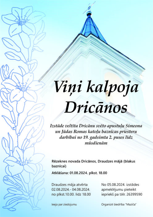 Catūrtdiņ, 1. augustā, 18.00 stuņdēs Drycānu draudzis sātā, Rēzeknis nūvodā, tiks atkluota izstuode “Viņi kalpoja Dricānos”, informej bīdreibys “Maziča” puorstuovi. Tei byus kai pastuoveiguo ekspoziceja, kas viesteis par Drycānu svātūs apostolu Simeona i Judys Romys katuoļu draudzis bazneicys viesturis leiklūčim, izceļūt tī kolpuojušūs prīsterus i jūs īguļdejumu.