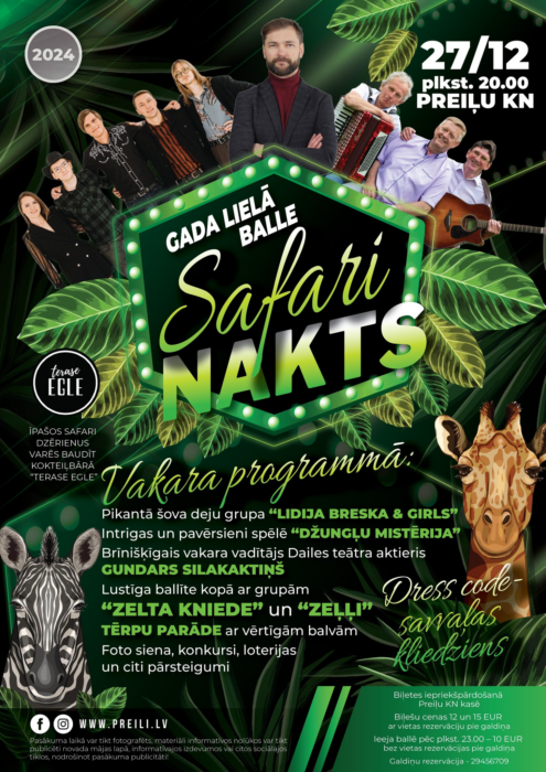Preiļūs itamā Zīmyssvātku nedeļā – 27. decembrī – vysi teik aicynuoti iz lelū goda balli “Safari nakts” Preiļu kulturys nomā kūpā ar akteri Gundaru Silakaktiņu. Svātku nūskaņuos varēs izbaudeit ari kokteiļu bāra nu Aglyunys “Terase Egle” gataveitūs kokteiļus. Jemit leidza draugus – byus korsts!