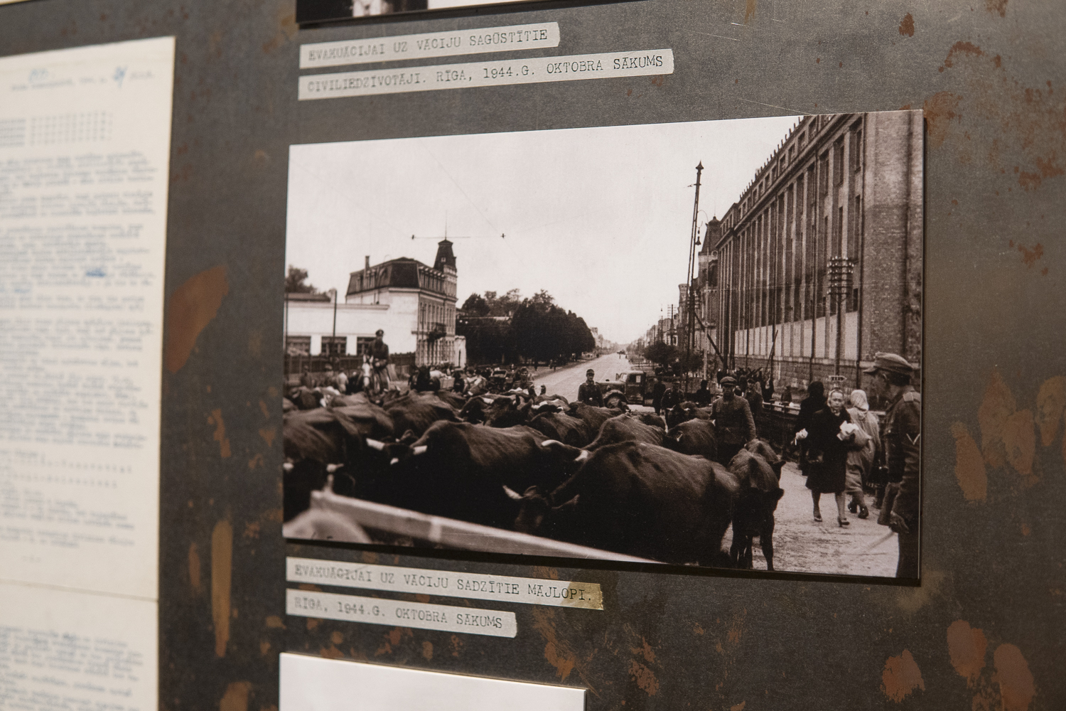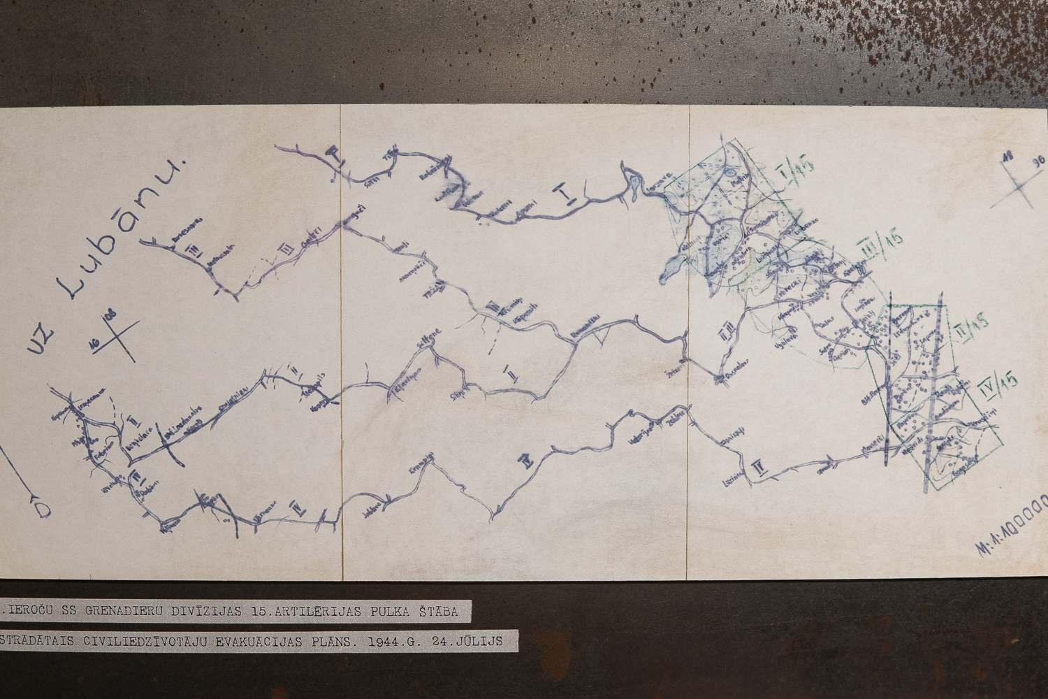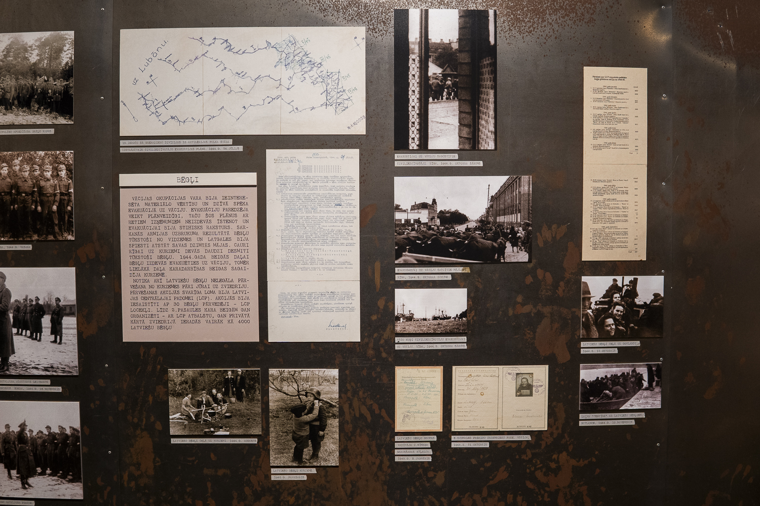 Jānis Tomaševskis ekspozicejā paruoda vēļ vīnu viesturis līceibu nu 2. pasauļa kara laika, kas saisteita ar Latgolu. 1944. gods juļa vydā Latvejis teritorejā ar kaujom atsagrīze kai Sorkonuo armeja, tai Latvīšu legiona vīneibys. 15. divizeja atsakuopšonuos kaujuos nu Krīvejis beja cīši sakauta i tyka aizsyuteita puorformiešonai iz Vuoceju, tok atseviškys tuos vīneibys, tymā skaitā 15. artilerejis pulks palyka Latvejā i pīsadaleja kaujuos pi Lubuona azara. Kod teritorejuos īguoja Sorkonuo armeja, daudzi tūs dzeivuotuoji devēs biegļu gaituos – nu Latgolys iz Vydzemi, tod Reigu i tuoļuok Kūrzemi. Militarūs vīneibu štabim vajadzēja veiduot biegļu atsakuopšonys ceļus. Kara muzejā var īpasazeit ar 15. artilerejis pulka štaba izstruoduotū civilīdzeivuotuoju evakuacejis planu, kas datāts ar 1944. gods 24. juli. Tymā izzeimāti celi, pa kurim bieglim beja drūsai atsakuopt. Sūpluok planam radzams ari pulka komandera paraksteita paviele vysu divizionu komanderim ar aizdavumim, kas karaveirim juopaveic evakuacejis laikā, kab paleidzātu “naziņā i bez paleidzeibys palykušim tautīšim”. Jis pastreipoj, ka civiluos īstuodis itū vaicuojumu pamatušys nūvuortā. Tomaševskis soka, ka tei bejuse itam laikam narakstureigai humana apsaīšona ar bieglim. Nareši cylvākim vīnkuorši lyka izavuokt nu sovu sātu, deļtuo ka tiuleņ tī suoksīs karadarbeiba. Palikt byutu beistamai, tok beja daļa ļaužu, kurī nagribēja laistīs paceli, partū aizguoja dzeivuotu mežā. Tai darejuse ari poša viesturnīka babys saime Borkovys pusē.