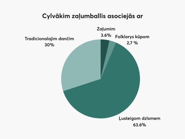 Portala lakuga.lv skaiteituoju aptaujā pasaruoda, ka zaļumballis vysu vaira cylvākim asociejās taišni ar ļusteigom dzīsmem i tradicionalajim daņčim, mozuok ar zaļumu elementim ci folklorys kūpom.