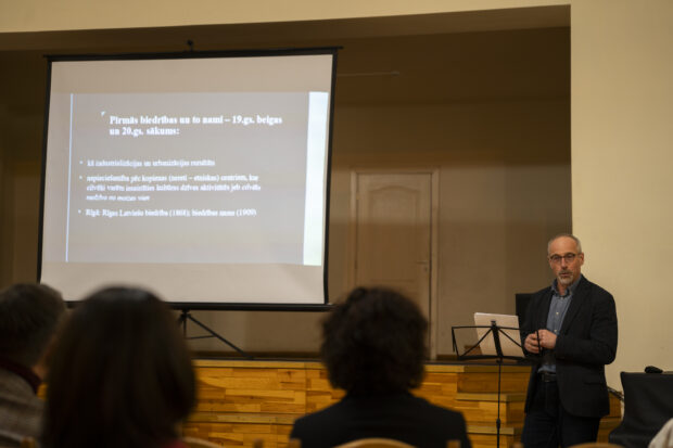 “Poši latgalīši nabeja vīnuoti. Beja vairuokys ītekmeigys politiskuos partejis, par pīmāru, Kristeiguo savīneiba. Tod izteikti beja jiutamys nasaskanis latgalīšu i baļtīšu vydā, kas tūlaik dabuoja ironisku pīskaņu – čyuli i čangali. Tai kai tymā laikā Latgolā pītryuka īriedņu, pedagogu i cytu darbinīku, nu puorejuos Latvejis iz Latgolu brauce cylvāki, kūpumā ap 40 tyukstūšom latvīšu. Jī ite suoce veiduot organizacejis i bīdreibys. Latgalīši saprota, ka jim ari ir vajadzeiga bīdreiba, kas apvīnuotu,” nūruodeja viesturnīks.