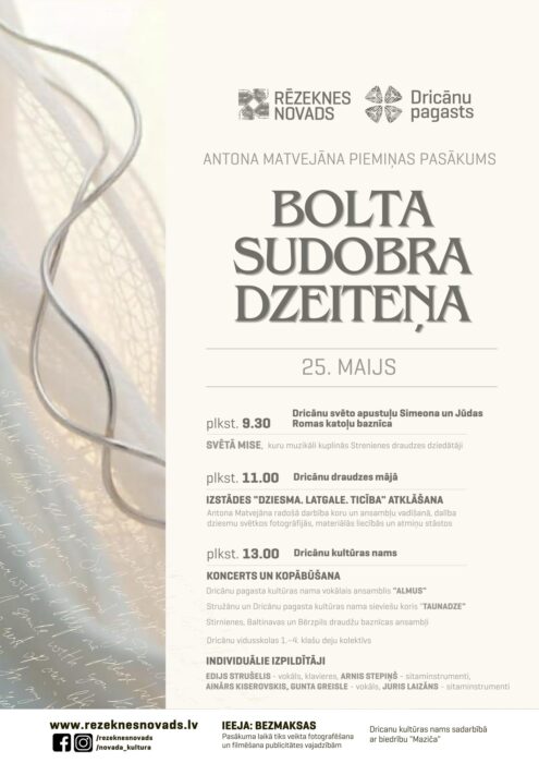 Svātdiņ, 25. majā, vysys dīnys garumā Drycānūs tiks gūdynuota dzīšmu autora, varganista, dirigenta, koru i ansambļu vadeituoja, školuotuoja, rakstnīka, kateheta i sabīdryskuo darbinīka Ontona Matvejāna pīmiņa. Nūtikšonys suoksīs ar Svātū Misi Drycānu Romys katuoļu bazneicā, kam sekuos izstuodis “Dziesma. Latgale. Ticība” atkluošona draudzis sātā, kai ari koncerts i byušona kūpā kulturys nomā.