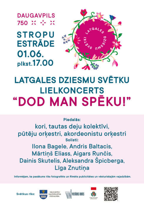Piec Varakļuonu nūvoda svātku celi vess iz Daugovpili, kur 1. junī Stropu estradē gaidoma Latgolys dzīšmu svātku kulminaceja ar Latgolys i cytu nūvodu korim, cyldynojūt latvīši i eipaši latgalīšu dzīsmis lelkoncertā “Dod man spēku!”. Byus kori, doncuotuoju ansambli, akordeonisti i pyušamūs instrumentu orkestri – vaira nakai 3600 dalinīku. Sasagatavejuši byusim pamateigi! Lelkoncertā pats byušu vīns nu solistu kūpā ar Ilonu Bageli, Aigaru Runči, Aleksandru Špicbergu, Daini Skuteli i cytim. Skanēs “Skaidra volūda”, “Saule, pērkons, Daugava”, “Lobs bej’ puika myusu Jezups”, “Aiz azara augsti kolni” i cytys meilys dzīsmis, taipat izskanēs Jura Kulakova i Normunda Beļska dzīsme “Dod man spēku, dod man laiku”. Koncerts byus cīši, cīši spieceigs!