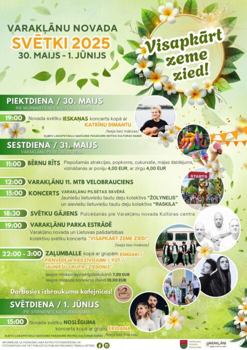 Šaļti pyrma dzīšmu svātku Daugovpilī aicynoju sasatikt Varakļuonu nūvoda svātkūs, kas byus nu pīktdīnis, 30. maja, da svātdīnis, 1. juņa. Svātki saīt vīnreizeji aiz tuo, ka šūgod Varakļuonu nūvods pagaiss. Trejuos svātku dīnuos byus daudzi nūtikšonu i dalinīku, bet svātku golvonajā dīnā (sastdiņ, 31. majā) varakļuonīšus i vysus gostus gaida aktivitatis jau nu poša reita, taipat byus svātku dalinīku guojīņs i lelais koncerts parka estradē ar dzīduotuojim, doncuotuojim i cytim dalinīkim, piec kuruo zaļumbale ar grupom “Pienvedēja piedzīvojumi”, “Yūt”, “Rīmdari” i jaunīšu grupa “Ziedonis”. Maņ pošam koncertā byus kai vadeituoja, tai dzīduotuoja lūma, byus vareiba paraudzeit ari sev naīrostys lītys. Niu maņ reizi nu reizis ļauds lyudz dareit, dzīduot sev kū naīrostu i es ļaunūs.