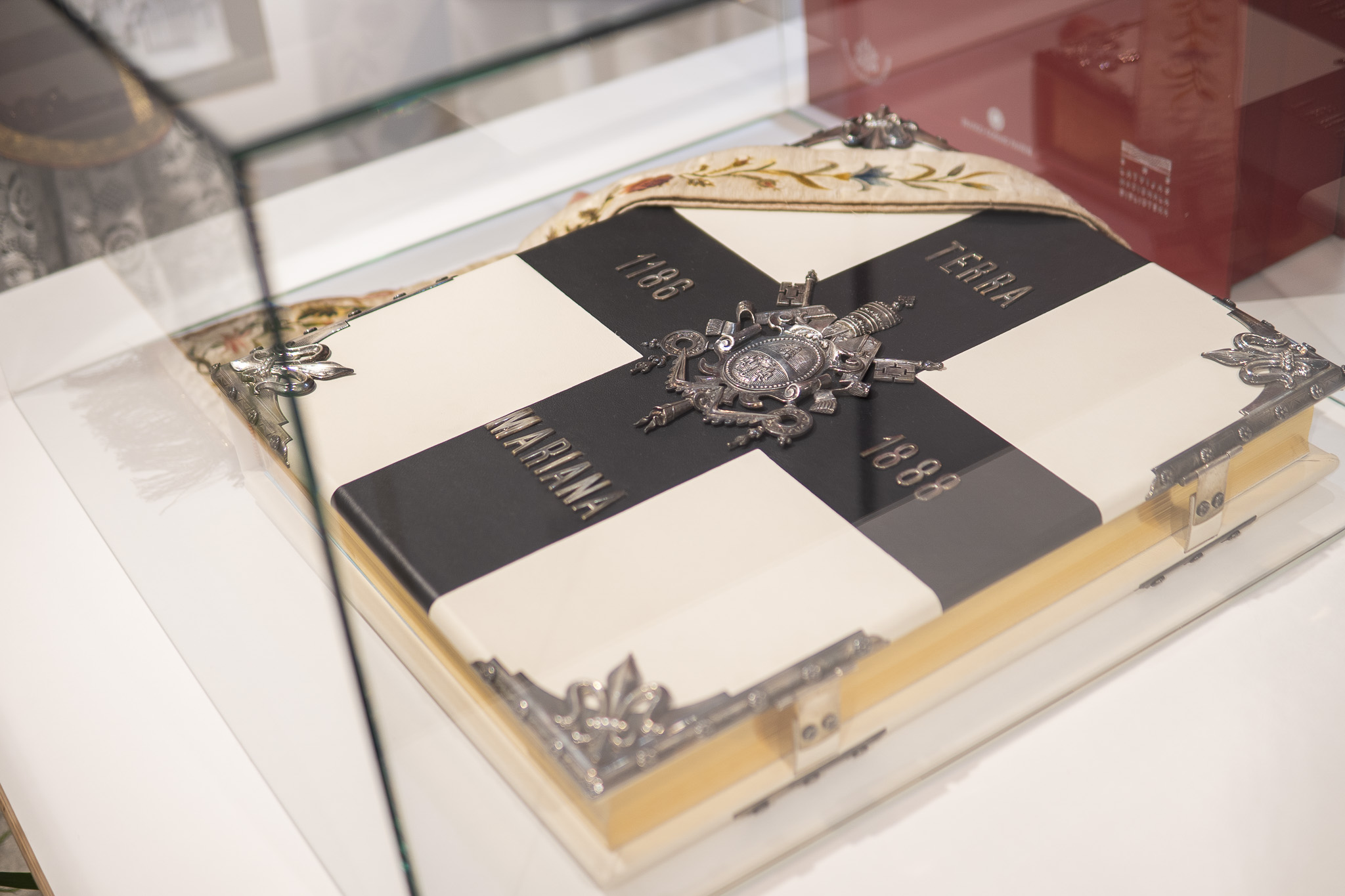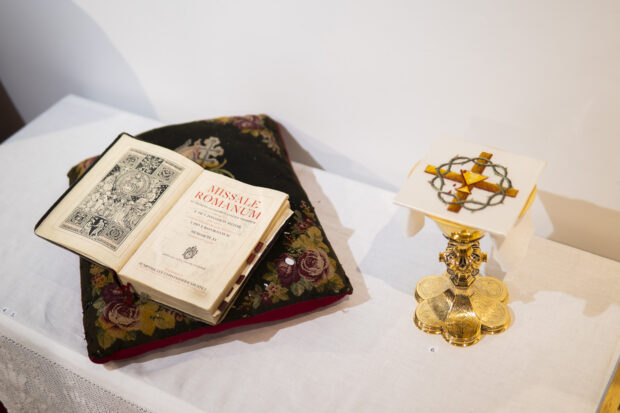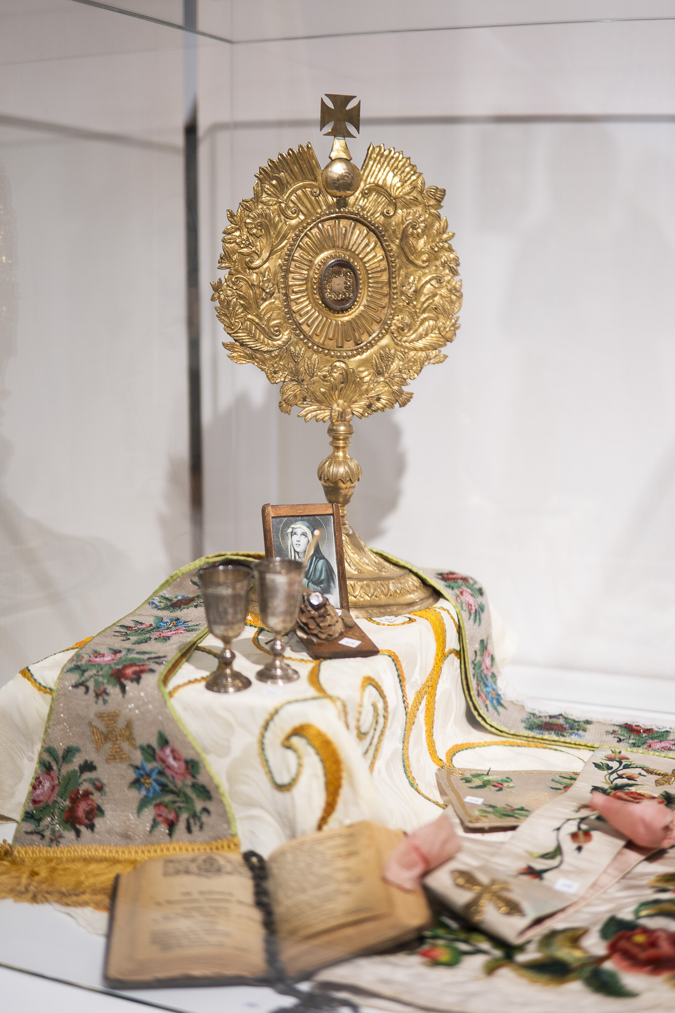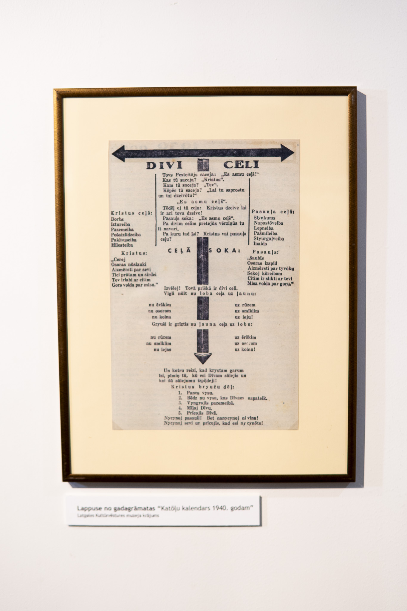 Katuoļticeiba ir vīna nu Latgolys regiona nūzeimeiguokūs identitatis sovpateibu. Deļtam vīns nu izstuodis bloku nūsaukumu ir “Rožukroņa Karaliene, lūdz par mums!”, kurs atkluoj katuoļticeibys i Jaunovys Marijis kulta nūzeimi Latgolys identitatē. Godu symtu laikā Jaunovys Marijis tāls ir saplyuds ar Muorys mitiskū tālu, simbolizejūt spāku, gaismu i aizsardzeibu. Itamā sadaļā apsaverami vysaidi eksponati, kas ir saisteiti ar kristeigajom tradicejom, kur rūzei ir eipaša simboliska vīta. Par pīmāru, lūgu rozetis, kas ir naatjamama vydslaiku bazneicu arhitekturys sastuovdaļa. Taipoš rūzis motivs ir bīži sastūpams goreidznīku liturgiskajūs tārpūs i prīškmatūs, oltoru rūtuojumūs i svātbiļdēs. Izstuodē var apsavērt ari “Terra Mariana” (1186-1888) albuma kopeju, kas ir graznys izdavums, kurū Baļtejis katuoli duovuojuši pavestam Leonam XIII juo prīstereibys 50 godu jubilejā.
