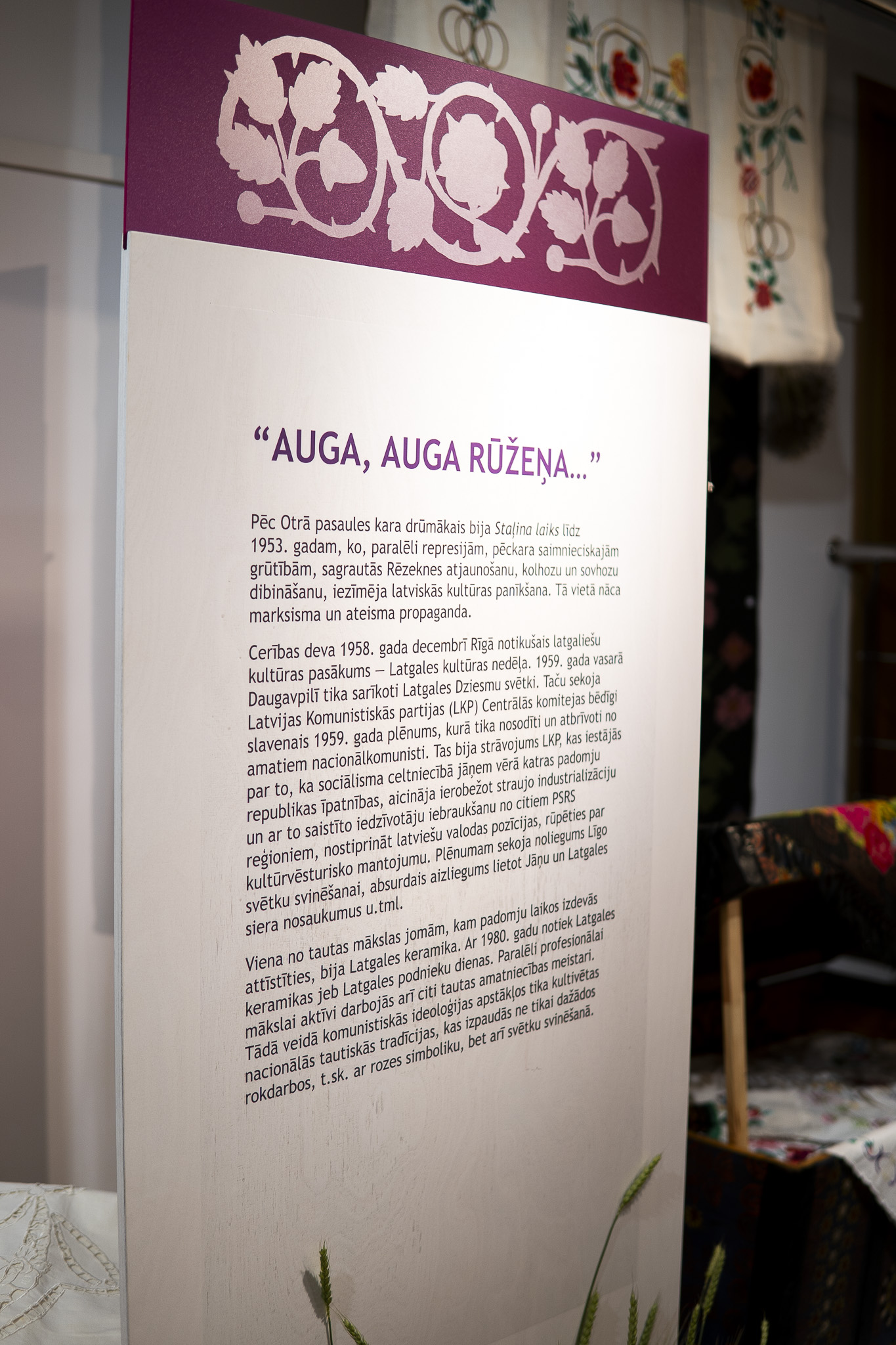 Ekspoziceja “Auga, auga rūžeņa…” simbolizej cereibys i atdzimšonys laiku piec kara. Koč ari kolhozu i sovhozu dybynuošona īzeimēja latvyskuos kulturys paneikumu, tys ari beja laiks, kod nūsastyprynuoja Latgolys amatnīceibys tradicejis, eipaši Latgolys keramika. Nu 1980. gods tyka organizātys kasgadejuos Latgolys pūdnīku dīnys. Taipoš paraleli profesionalai muokslai dorbuojuos ari cyti tautys amatnīceibys meistari, taidā veidā komunistiskuos ideologejis apstuokļūs kultivejūt nacionaluos tautyskuos tradicejis.