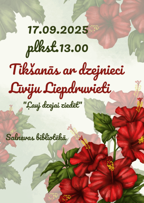 17. septembrī 13 stuņdēs Ludzys nūvoda Saļnovys bibliotekā nūtiks sasatikšona “Ļauj dzejai ziedēt” ar dzejneicu Līviju Līpdryvīti. Autore da šam izdavuse deveņus dzejūļu kruojumus i itūgod tur nūceju izdūt ari dasmytū.