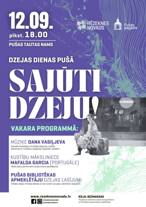 12. septembrī 18 stuņdēs Rēzeknis nūvoda Pušys tautys nomā sevkurs aicynuots iz Dzejis dīnom veļteitū pasuokumu, kurā dzeja atsadzeivuos caur vysaidom muokslys formom. Vokora programā muzike Dana Vasiļjeva aizvess klauseituojus muzykalā ceļuojumā, izpyldūt dzīsmis ar myusu dīnu latgalīšu dzejnīku vuordim. Sovpus kusteibu muokslineica Mafalda Garcia pīduovuos performanci audio ainovu pavadejumā. Taipat nūtiks ari Pušys bibliotekys apmaklātuoju dzejis skaitejumi. Īīšona par breivu.