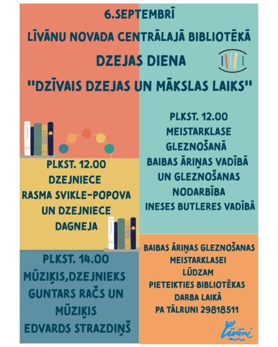 6. septembrī 12 stuņdēs Leivuona nūvoda Centraluo biblioteka aicynoj iz pasuokumu, kurā sasatiks vuords i kruosa “Dzīvais dzejas un mākslas laiks”. Sovu rodūšū pasauli atkluos latgaliski rokstūšuos dzejneicys Rasma Svikle-Popova i Dagneja (Dagnija Dudarjonoka), kurūs dorbūs dzeivoj Latgolys garša, dzymtuos zemis ritmi i sirds syltums. Sovpus 14 stuņdēs kūpā ar Edvardu Strazdiņu muzicēs komponists i dzejnīks Guntars Račs. Pasuokumu boguotynuos ari rodūša gleznuošonys meistarklase pīaugušajim Baibys Ārinis vadeibā i nūdarbeiba školānim Inesis Butleris vadeibā. Īīšona par breivu.