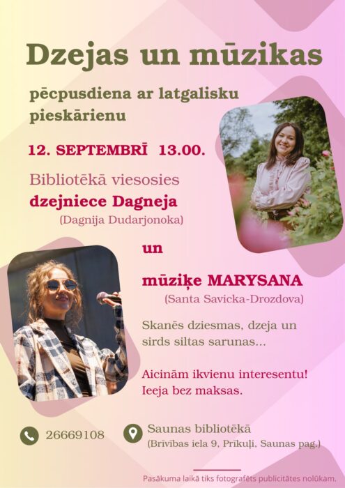 12. septembrī 13 stuņdēs Preiļu nūvoda Saunys bibliotekā skanēs dzīsmis, dzeja i sarunys. Pasuokumā pīsadaleis latgalīšu dzejneica Dagneja i muzike Santa Savicka-Drozdova nu grupys “Marysana”. Īīšona par breivu.