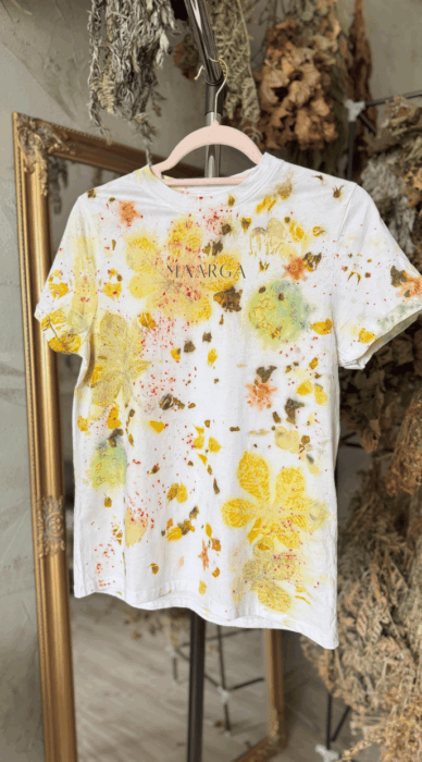 Kab ekoprinta tehnikā toptu kaids apgierbs, procesam juosasuoc dobā – ar augu, zīdu i lopu vuokšonu atbylstūšā sezonā. Piečuok tūp īcere par dizainu i tuo pīlītuojumu, teik izalaseits atbylstūšs audums – zeids, kūkvylna voi lyns. “Procesā audums teik ryupeigai izmozguots i kūdynuots, kab tys lobuok uzjimtu augu pamastūs nūspīdumus. Iz auduma teik salykti augi, tū cīši satyn i līk tvaiciešonys kotlā, kur dobys kruosys i roksti puorsanas iz auduma,” ekoprinta procesu stuosta Zaiga. “Nūslāgumā ir piecapstruode – mozguošona i kaļtiešona, kas gola materialam dūt nūtureibu i pabeigteibu.” Zaiga pastreipoj, ka ekoprinta klienti ir ļauds, kas nūviertej ilgtspiejeigu dizainu i grib sovā eipašumā dabuot nazkū eistyn unikalu. “Mes raugom radeit izstruoduojumus, kas organiskai īsakļaun sevkurā stylā i interjerā kai elegants papyldynuojums voi akcents.”