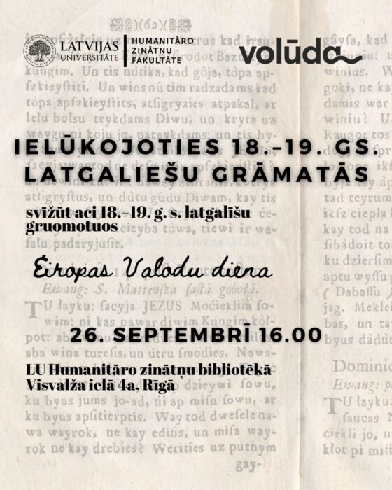 Pīktdiņ, 26. septembrī, svietejūt Eiropys Volūdu dīnu i atbolstūt nūtikšonu cyklu “Latviešu grāmatai 500”, Latvejis Universitatis (LU) Humanitarūs zynuotņu fakultate, sasadorbojūt ar latgalīšu kulturys kusteibu “Volūda”, aicynoj iz latgalīšu senejim izdavumim – 18. i 19. godu symtā izdūtajom gruomotom – veļteitu izzynūšu piecpušdīni, informej pasuokuma organizatori.