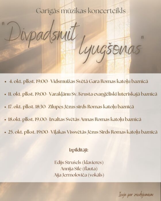 Ituo gods oktobrī i novembrī divpadsmit Latvejis bazneicuos izskanēs latgalīšu goreiguos muzykys cyklys “Divpadsmit lyugšonys”. Sveču gaismā varēs baudeit Ontona Matvejāna dzīsmis i goreiguos dzīsmis, kas pīraksteitys Stiernīnis pusē.