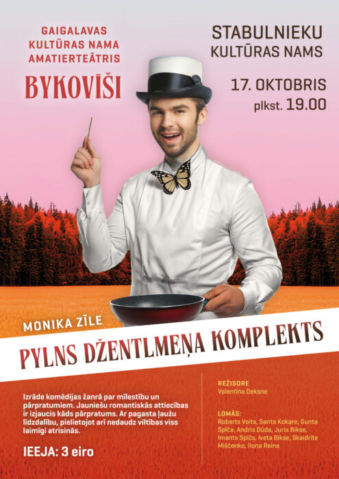 Tim, kam pateik teatra izruodis, 17. oktobra vokorā byutu juobrauc iz Preiļu nūvoda Stabuļnīkim pasavērt Rēzeknis nūvoda Gaigalovys pogosta amaterteātra “Bykovīši” īstudietū Monikys Zīlis komedeju “Pylns džentlmeņa komplekts” (režisore Valentīna Deksne). Prīca, ka “Bykovīši” lugys īstudej tik latgalīšu volūdā, a šūreiz izmontuots Monikys Zīlis lugys “Džentlmenis ar pannu” pošys autoris radeitais latgaliskais variants. Nūsavieru, patyka.