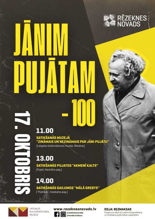 Atpyutys īspieju ari šūnedeļ na moz. Tim, kam interesej viesture i Latgolys cylvāki, pyrmom kuortom 17. oktobrī īsoku braukt iz Latgolys Kulturviesturis muzeju Rēzeknē, kur 11 stuņdēs tiks svieteita muokslys zynuotnīka Juoņa Pujata symts godu jubileja. Tuoļuok programa īspaideiga: 13.00 sasatikšona Nautrānu pogosta Pujatūs ar moto “Akminī kolts”, a 14.00 pasuokums “Muolā grabts” Iļžukolna pogosta “Pūdnīkūs”. Grybu saceit, ka man par Juoni Pujatu eipaša interese – jis eistyn ir muns nūvadnīks, dzims Gaigalovys pogostā.