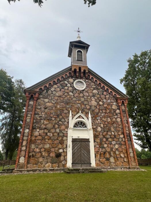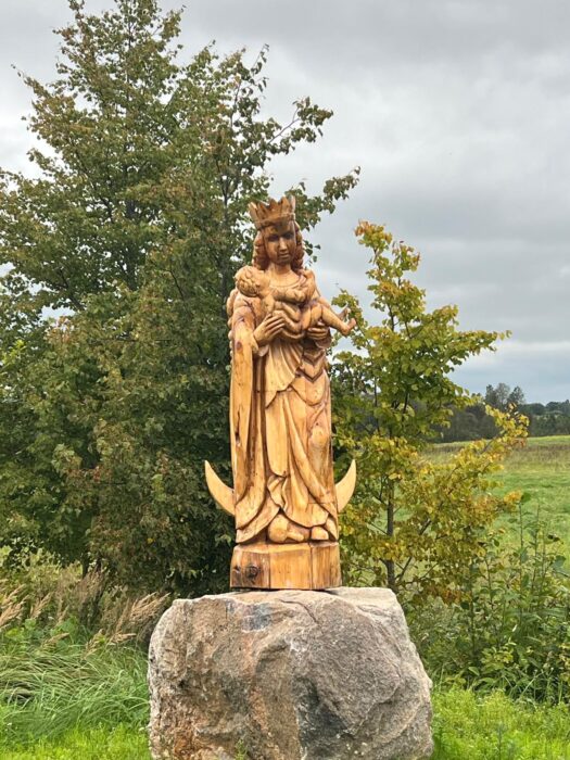 “Tuoļuok juosaver piec nūskaņuojuma, kai turpynuot ceļu. Var braukt vysaiži. Var braukt pa ūtru pusi Cirmys azaram. Drupeit juopabrauc pa šoseju i juonūsagrīž pa labi iz Cyskovu, kur atsarūn “Dzīvības Mātes Sekulārā Institūta Garīgais Centrs”. Tur var apsavērt vēļ vīnu skulpturu ar interesantu stuostu. Tei ir kopija skulpturai, kas ir Pīterbazneicys (Reigys Svātuo Pītera bazneicys – A.A.) relikveja, i kas kara laikā beja nūvasta iz Vuoceju, tok pyrma puora godu atsagrīze atpakaļ,” ceļuojuma stuostu nūslādz Ints.