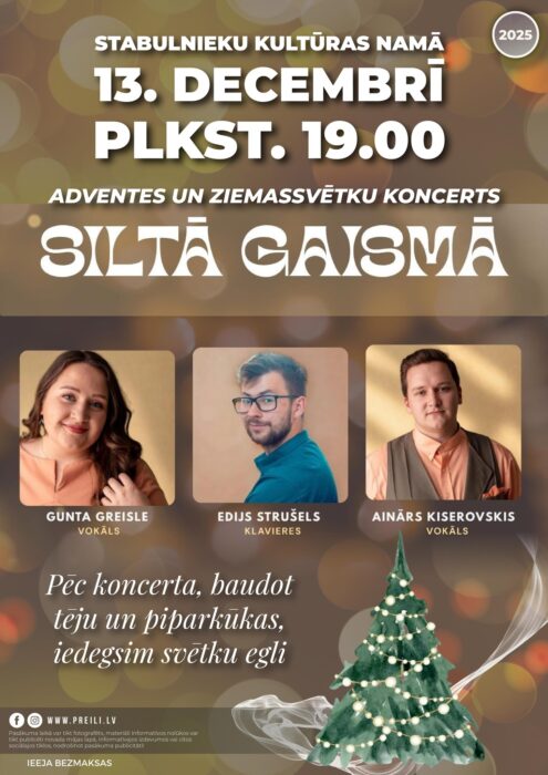 Adventa laiks – cylvāki otkon suoc ticēt lobajam i sātā īīt mīrpylns klusums. Itys laiks ir klusa gaisma goda tymsuokajuos dīnuos – šaļts, kod nūstuot, īelpuot dziļuok… Koncerta “Siltā gaismā”, kas 13. decembrī 19 stuņdēs byus Stabuļnīku kulturys nomā, dalinīki – Gunta Greisle (vokals), Edijs Strušels (klavīris), Ainārs Kiserovskis (vokals) – grib itū gaismu īdegt kūpā ar jums – ar dzīsmem, vuordim, syltumu.