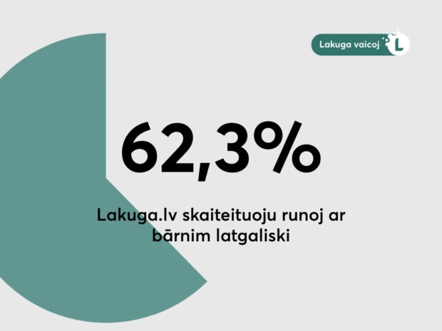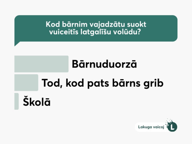 Portāls lakuga.lv apvaicuoja sovus socialū medeju sekuotuojus, kab saprast, cik daudzi nu jūs ar bārnim runoj latgaliski. Aptauja paruodeja, ka vaira nakai puse, t.i., 62,3 % runoj ar bārnim latgaliski. Taipoš leluokais vairums nu apvaicuotūs pīzyna, ka latgalīšu volūdu bārnim byutu juosuoc vuiceit jau nu pyrmsškolys vacuma.