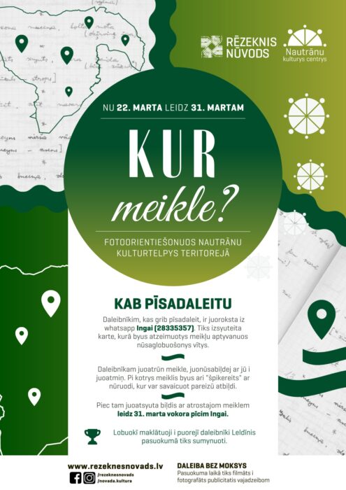 Sovutīs nu 22. da 31. marta Nautrānu kulturys centrys aicynoj īt dobā i īpazeit Nautrānu kulturtelpys folklorys boguoteibu, vaicojūt meiklis, kas ir vuoktys Nautrānu kulturtelpys teritorejā i ir daīmamys portalā garamantas.lv. Kab dasasaceitu, juoroksta Nautrānu kulturys centra kulturys pasuokumu organizatorei Ingai Vigulei iz WhatsApp (tel. nr. 28335357). Dalinīkim tiks izsyuteita karte, kurā byus atzeimuotys aptyvanuos nūsaglobuošonys vītys. Dalinīkam juoatrūn meikle, juonūsabiļdej ar tū i juoatmiņ. Pi kotrys meiklis byus ari “špikereits” ar nūruodi, kur var savaicuot pareizū atbiļdi. Biļdis ar atrostajom meiklem da 31. marta pīcu vokorā juonūsyuta Ingai. Lobuokī maklātuoji i puorejī dalinīki tiks sveikti Leldīnis pasuokumā “Skaņuo Leldīne”, kas nūtiks 5. aprelī 12 stuņdēs.