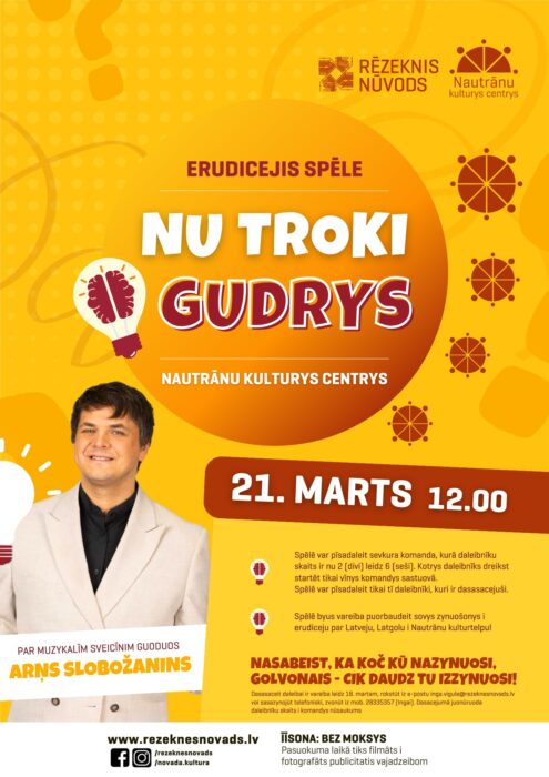 Erudicejis spēle “Nu troki gudrys!”, kas nūteik jau catūrtū reizi, itūgod byus 21. martā 12 stuņdēs Nautrānu kulturys centrā. Spēlē byus vareiba puorbaudeit sovys zynuošonys i erudiceju par Latveju, Latgolu i Nautrānu kulturtelpu. Spēlis moto: “Nasabeist, ka koč kū nazynuosi, golvonais – cik daudzi tu izzynuosi!” Spēlē var pīsadaleit sevkura komanda ar vismoz divejim, bet ni vaira par sešim dalinīkim, i kotrys dreikst byut tikai vīnys komandys sastuovā. Svareigi, ka var pīsadaleit tikai tī dalinīki, kuri ir dasasacejuši, deļtuo tys juoizdora sovlaiceigai – da 18. marta, rokstūt iz e-postu inga.vigule@rezeknesnovads.lv voi sasazynojūt telefoniski, zvonūt 28335357. Dasacejumā juonūruoda dalinīku skaits i komandys nūsaukums. Spēlē var pīsadaleit sevkurs grybātuojs – daleiba ir bez moksys i vacuma īrūbežuojumu! Par muzykalim sveicīnim pasuokumā ryupēsīs Arņs Slobožanins.